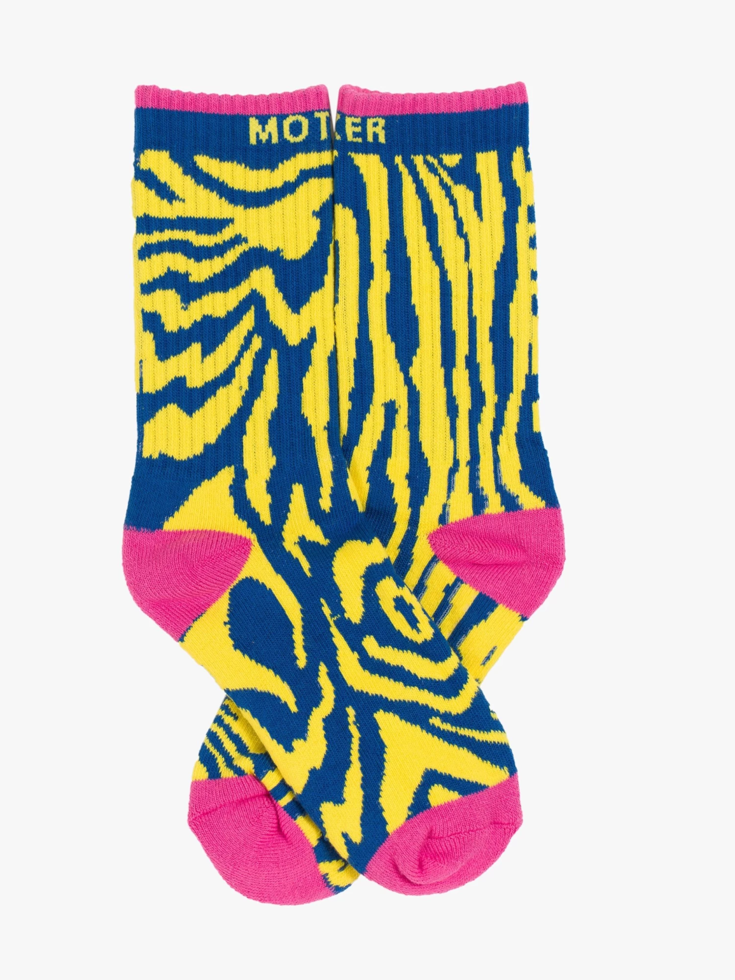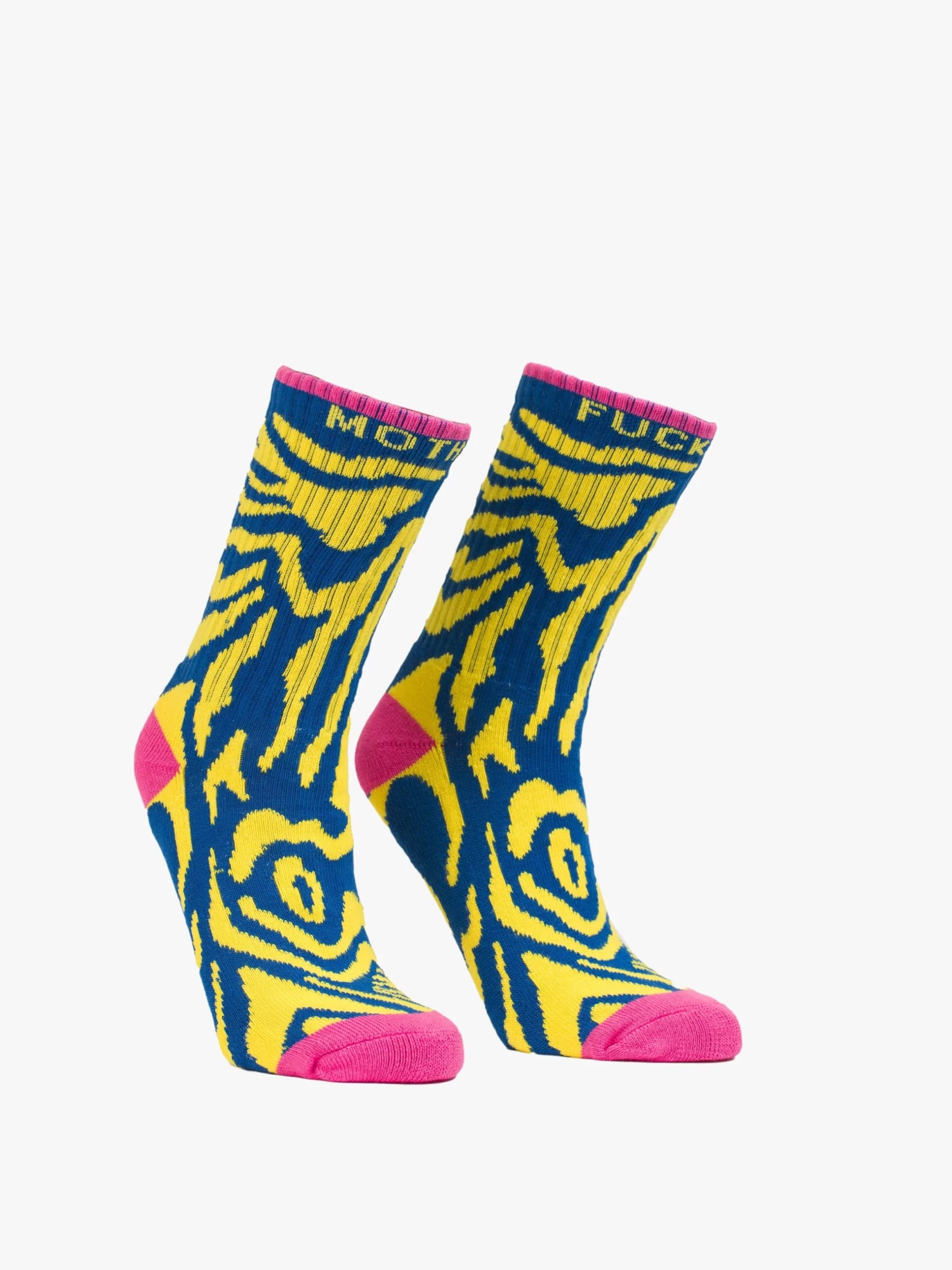 Trippy. Classic tube socks with an explicit message from MOTHER. Shown here in a bright yellow and blue zebra print with hot pink details and text in yellow.