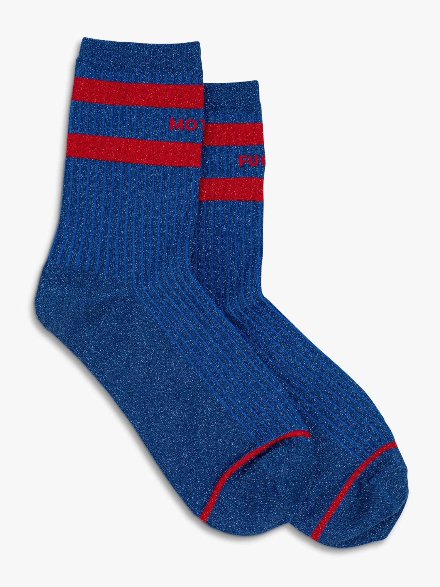 Knock your socks off. Classic tube socks with a bold message from MOTHER. Shown here in sparkly dark blue with red stripes and lettering.