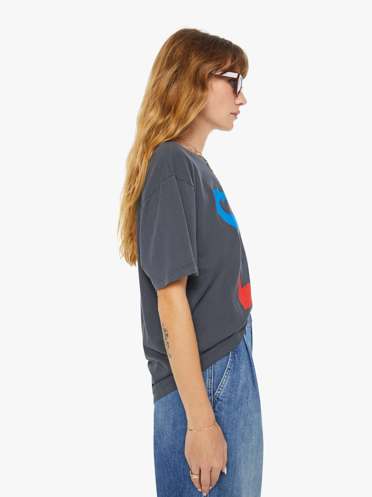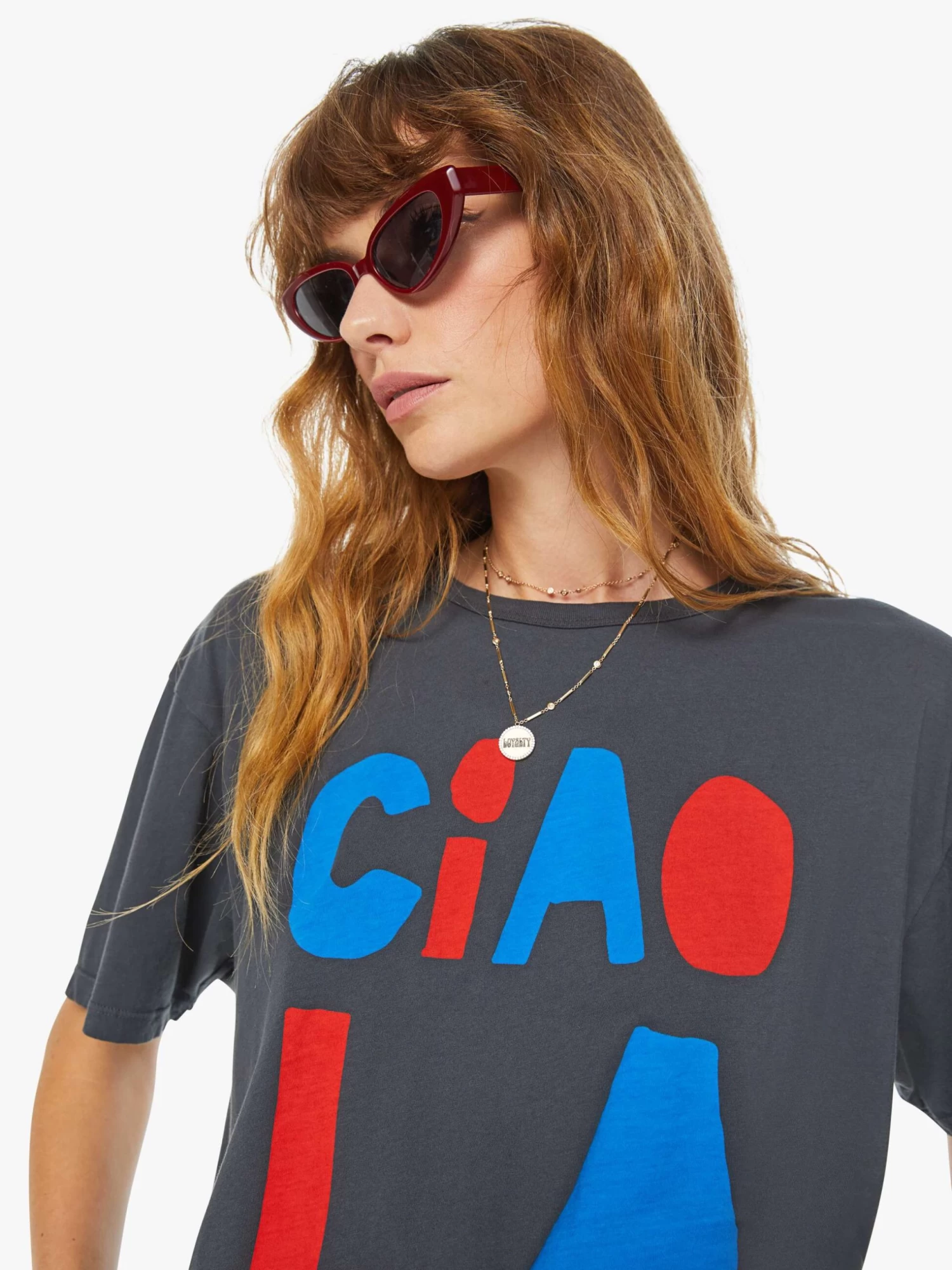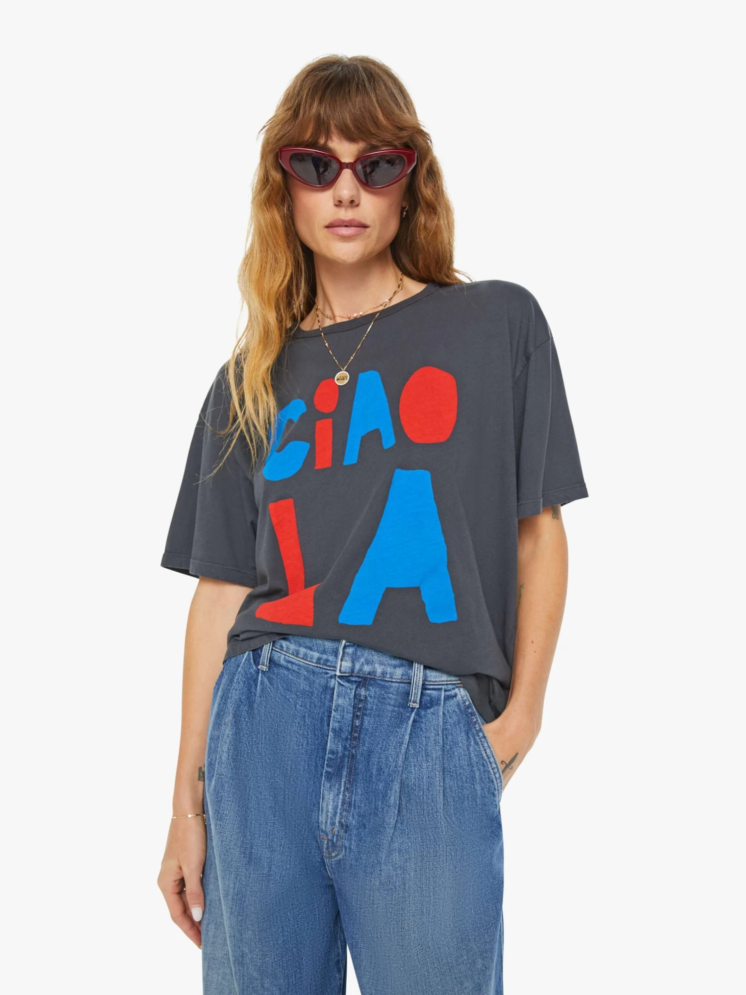 Catch you later. An oversized tee from the Clare V. x MOTHER capsule collection, a celebration of the brands’ shared love for Los Angeles that marries a rebellious California spirit with a French-leaning indie vibe. The Sleep Over in Ciao LA is designed with drop shoulders and an oversized fit, and is made from 100% supima cotton in dark grey with a red and blue text graphic on the front.