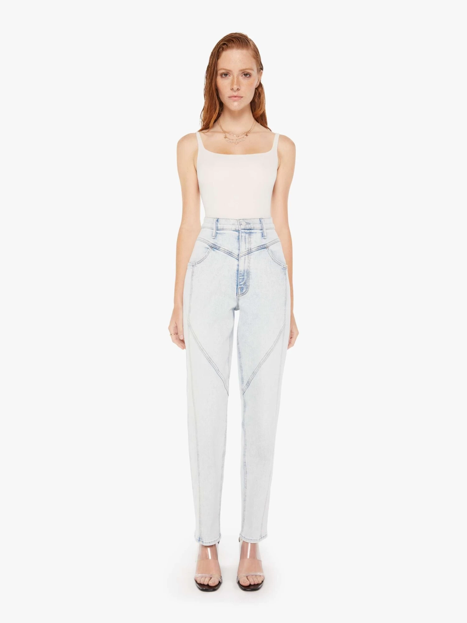 Meet me at the mall. Super high-waisted jeans with a narrow straight leg and V-shaped seams at the waist, thighs and straight down the front. Cut from denim with a touch of stretch, Glamour Shot is a super light blue wash with slightly darker seams and fading throughout.