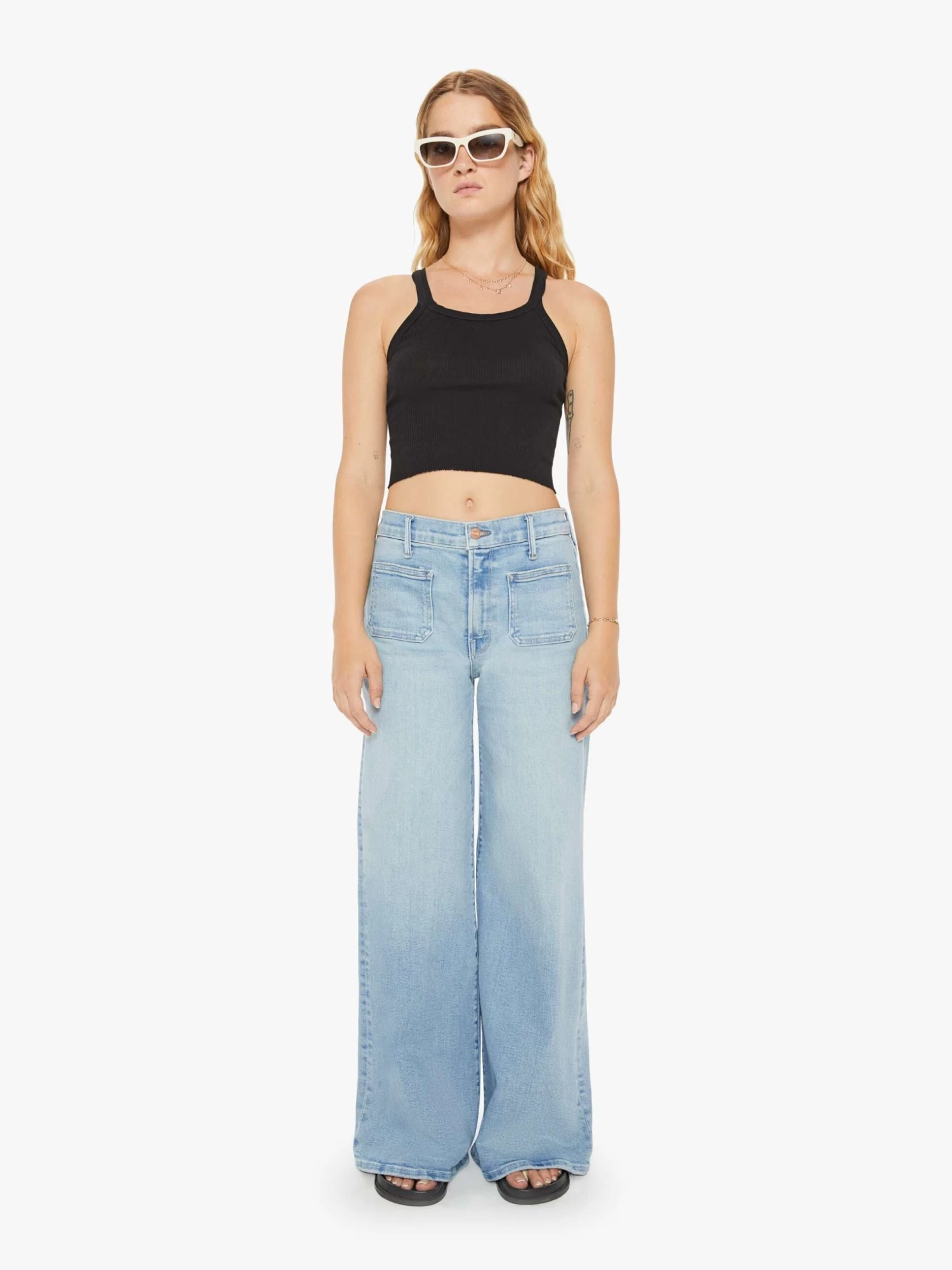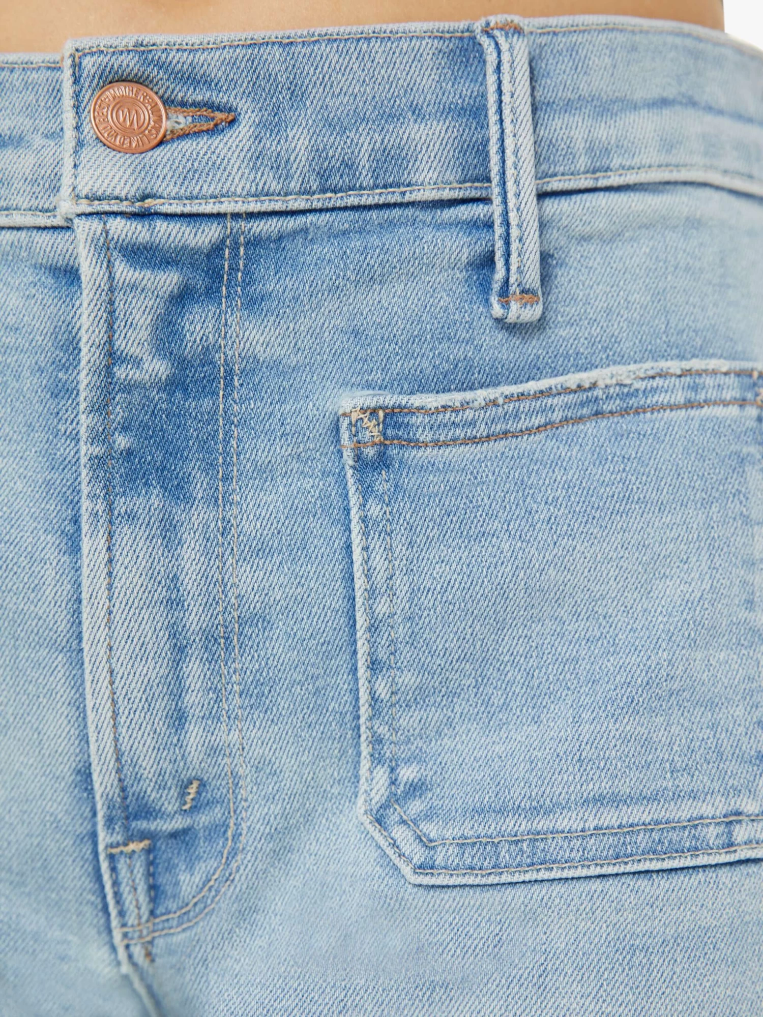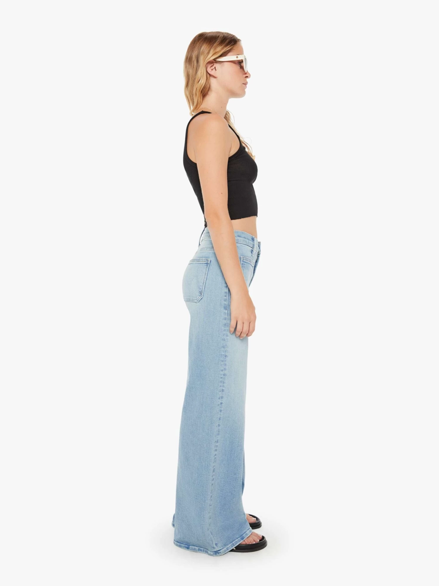 Wide leg pants with a high rise, long inseam and patch pockets. Cut from denim with a touch of stretch, California Cruiser is a light blue wash with fading and whiskering.
