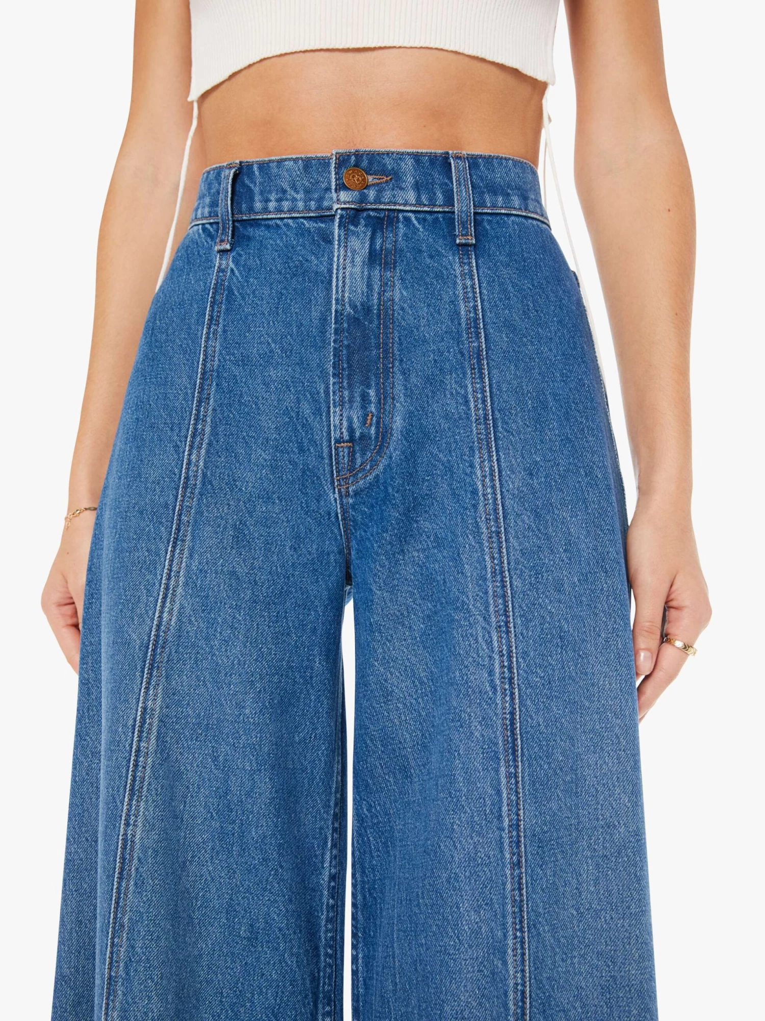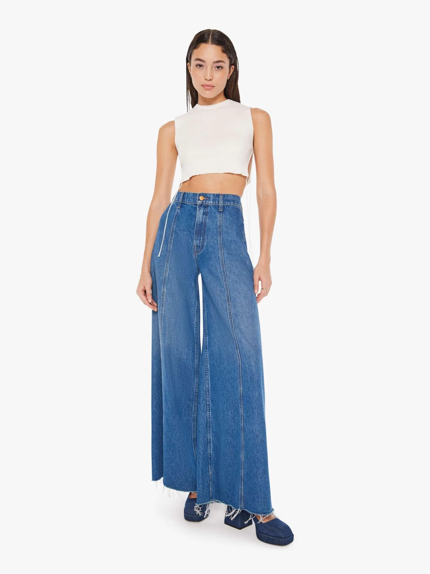 Wide-leg jeans from SNACKS!, a collection of unconstrained silhouettes leaning into exaggerated shapes and extreme proportions. Experimental and non-era specific. For everyone, or not. The high-rise jeans are designed with a flowy wide-leg, slit pockets, seams down the front, a 32-inch inseam and a frayed hem. Made from a recycled cotton blend, Yummy is a mid-blue wash with a pretzel-detailed button and candy-inspired interior rivets. Would you like a treat?