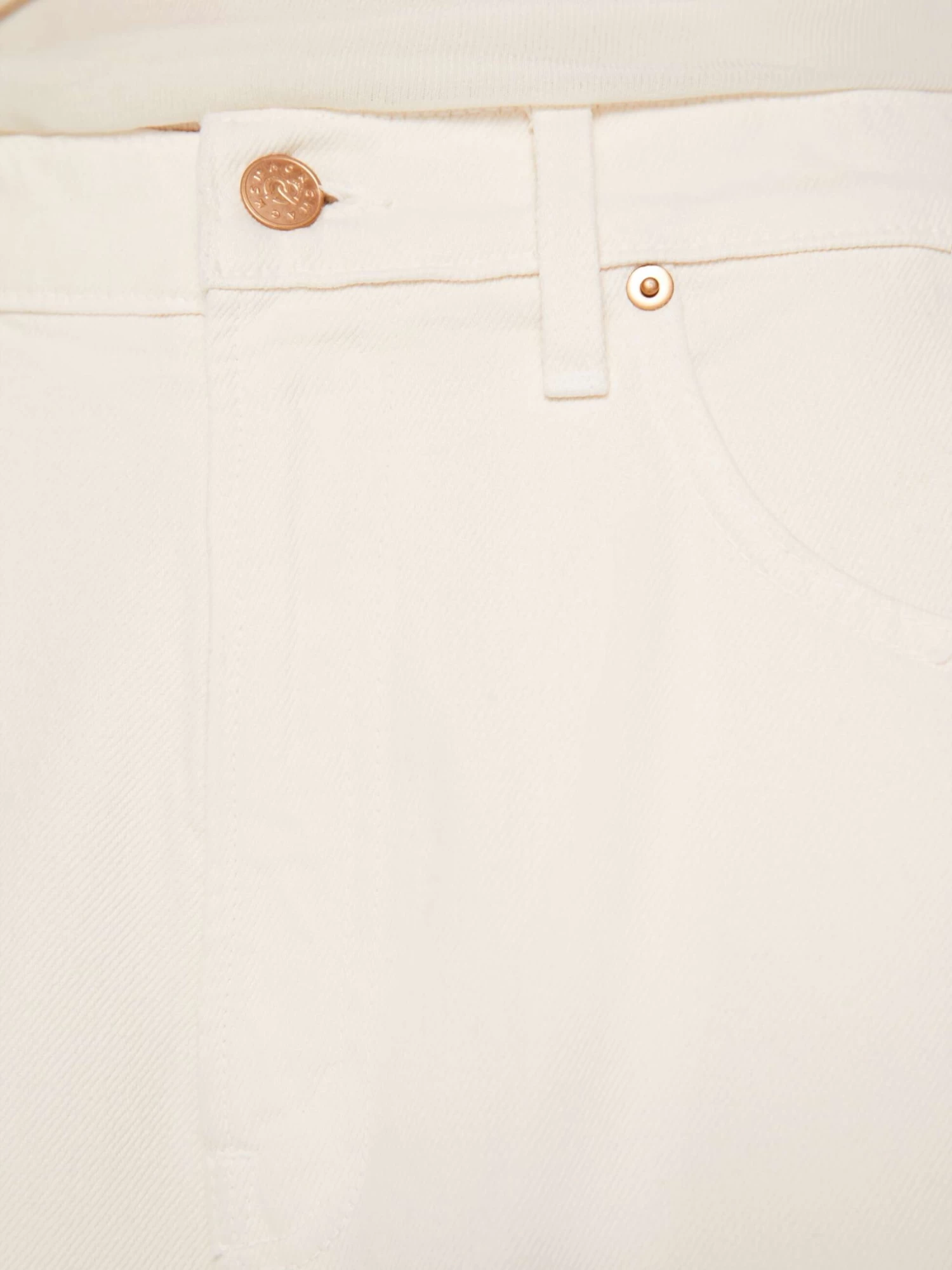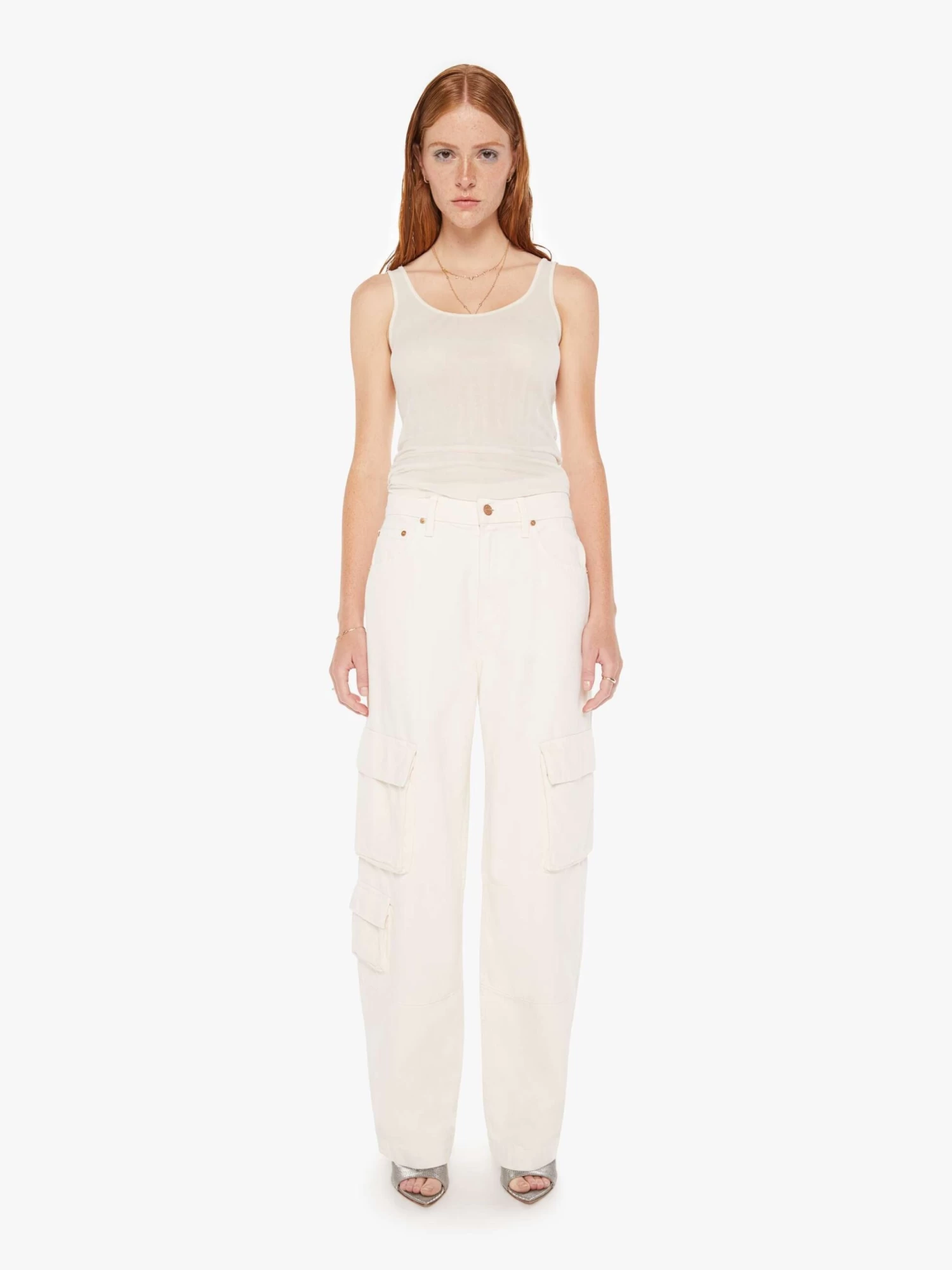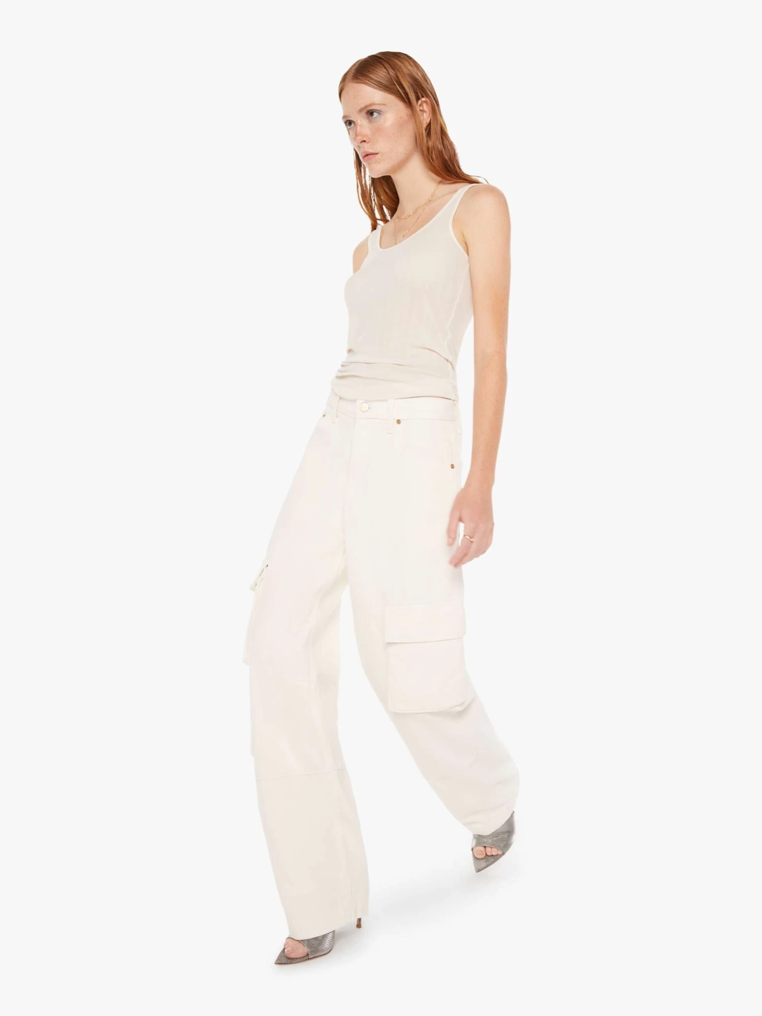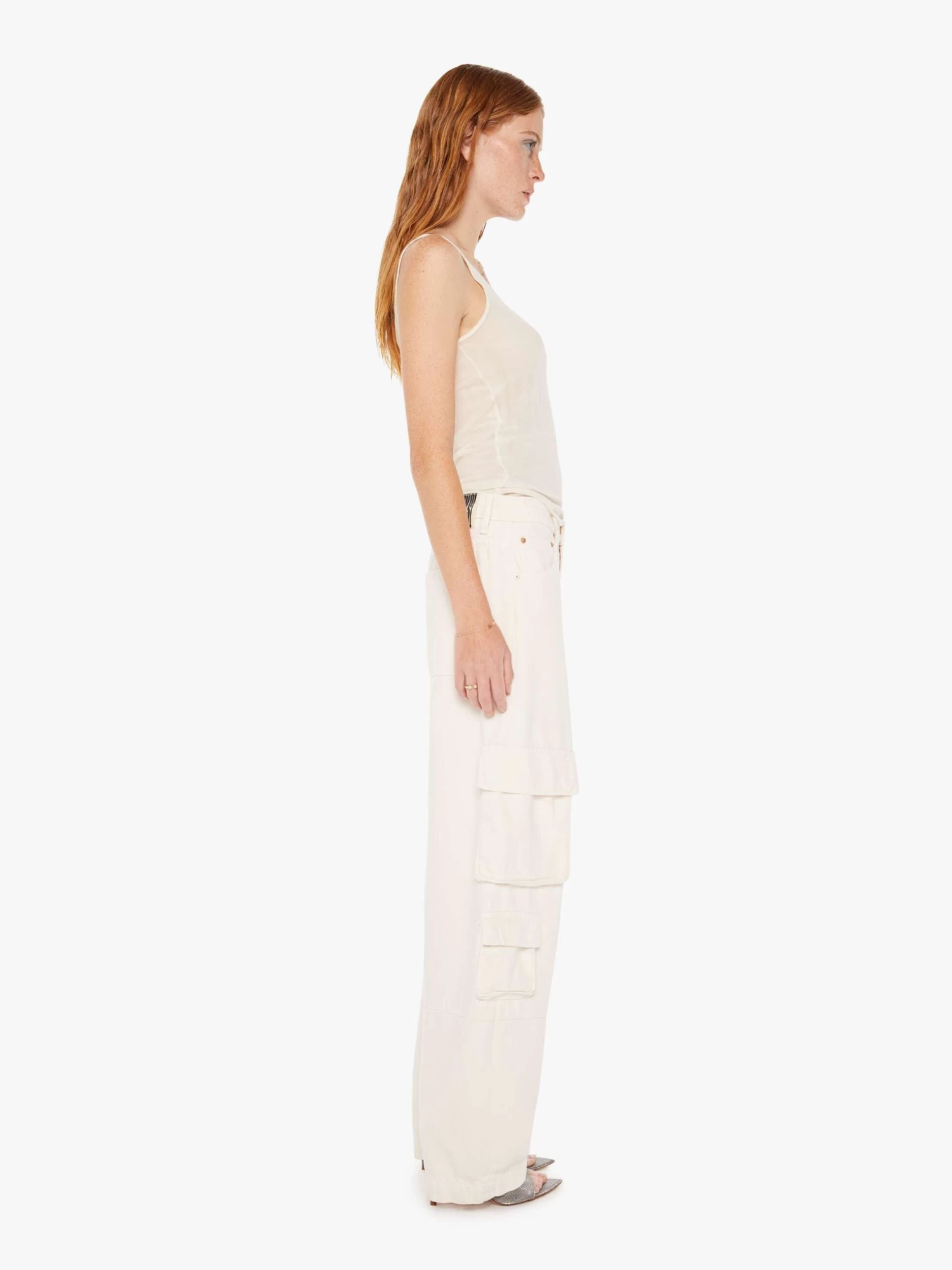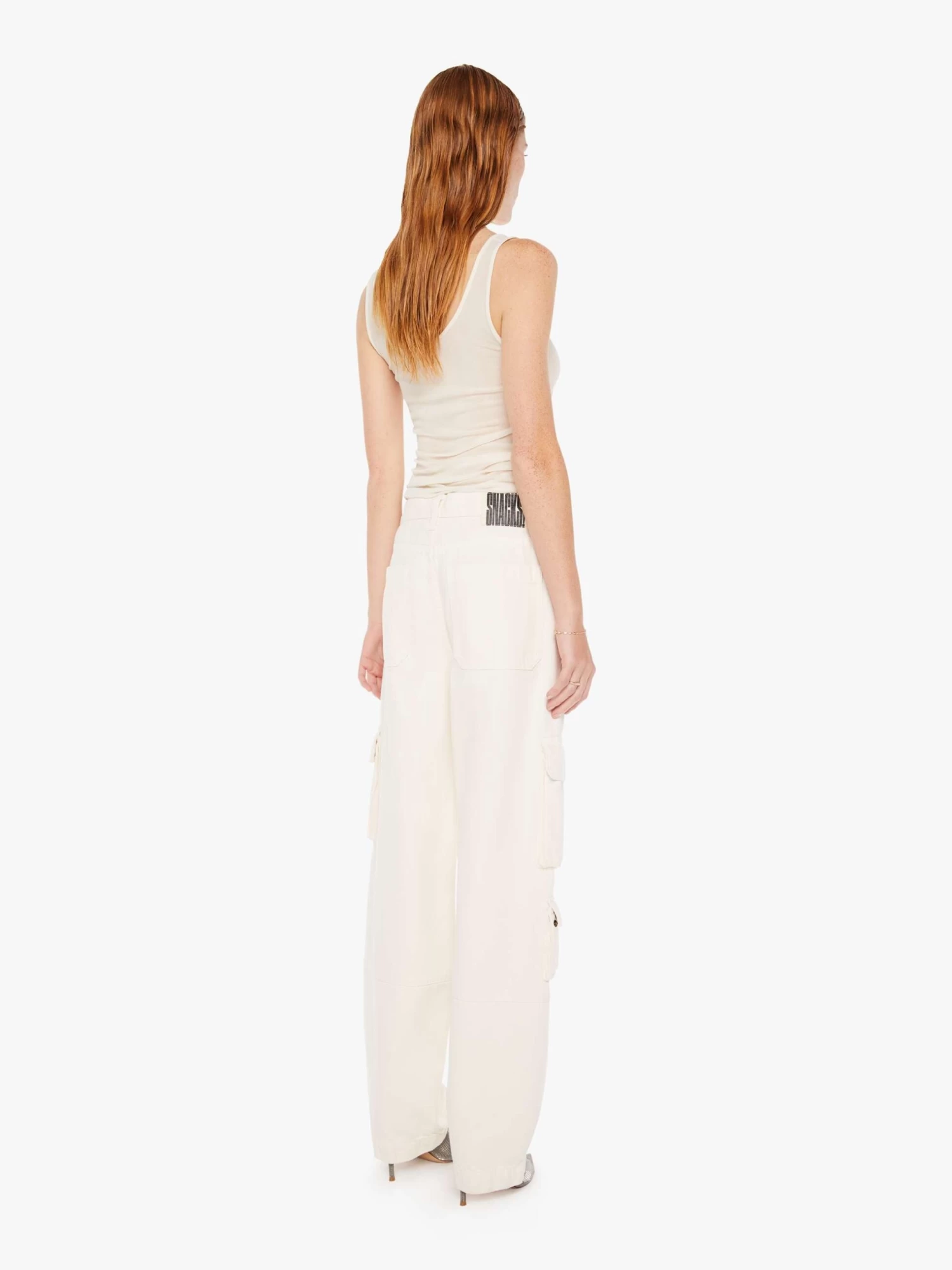 Cargo pants from SNACKS!, a collection of unconstrained silhouettes leaning into exaggerated shapes and extreme proportions. Experimental and non-era specific. For everyone, or not. Designed to be worn loose and low at the hips, the wide-leg pants feature a super high rise, long 31-inch inseam, cargo-inspired patch pockets and a loose, slightly baggy fit. Made from a cotton blend, Natural is an off-white wash with a pretzel-detailed button and candy-inspired interior rivets. Would you like a treat?