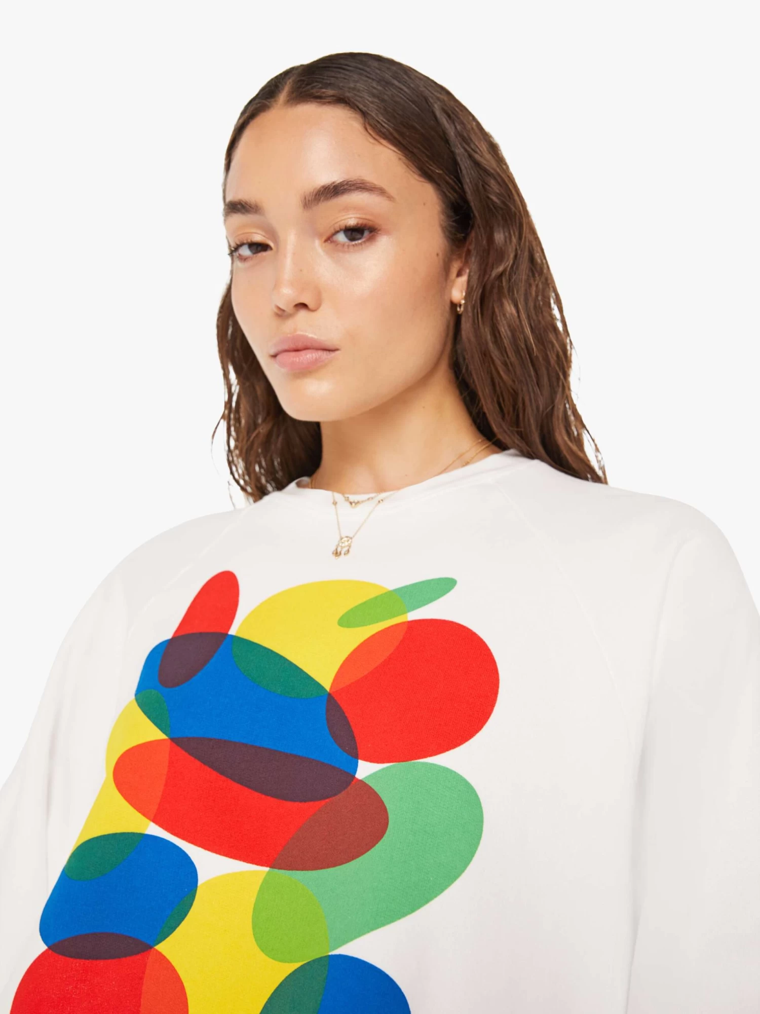 Flying colors. A cropped sweatshirt with a crew neck, drop shoulders and a raw hem. Cut from 100% cotton in white, the sweatshirt features an overlapping abstract graphic and text in black on the front.