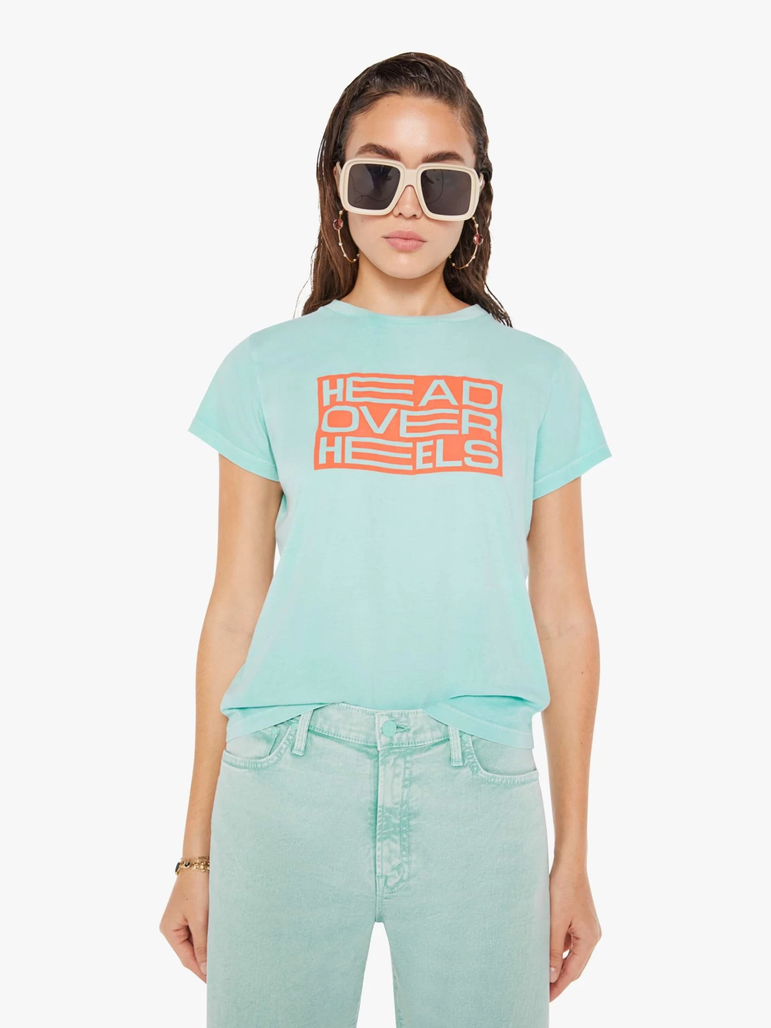 Upside down. A soft crewneck with a slim fit for a vintage look and feel. Made from 100% cotton in eggshell blue, the tee features an orange text graphic on the front.