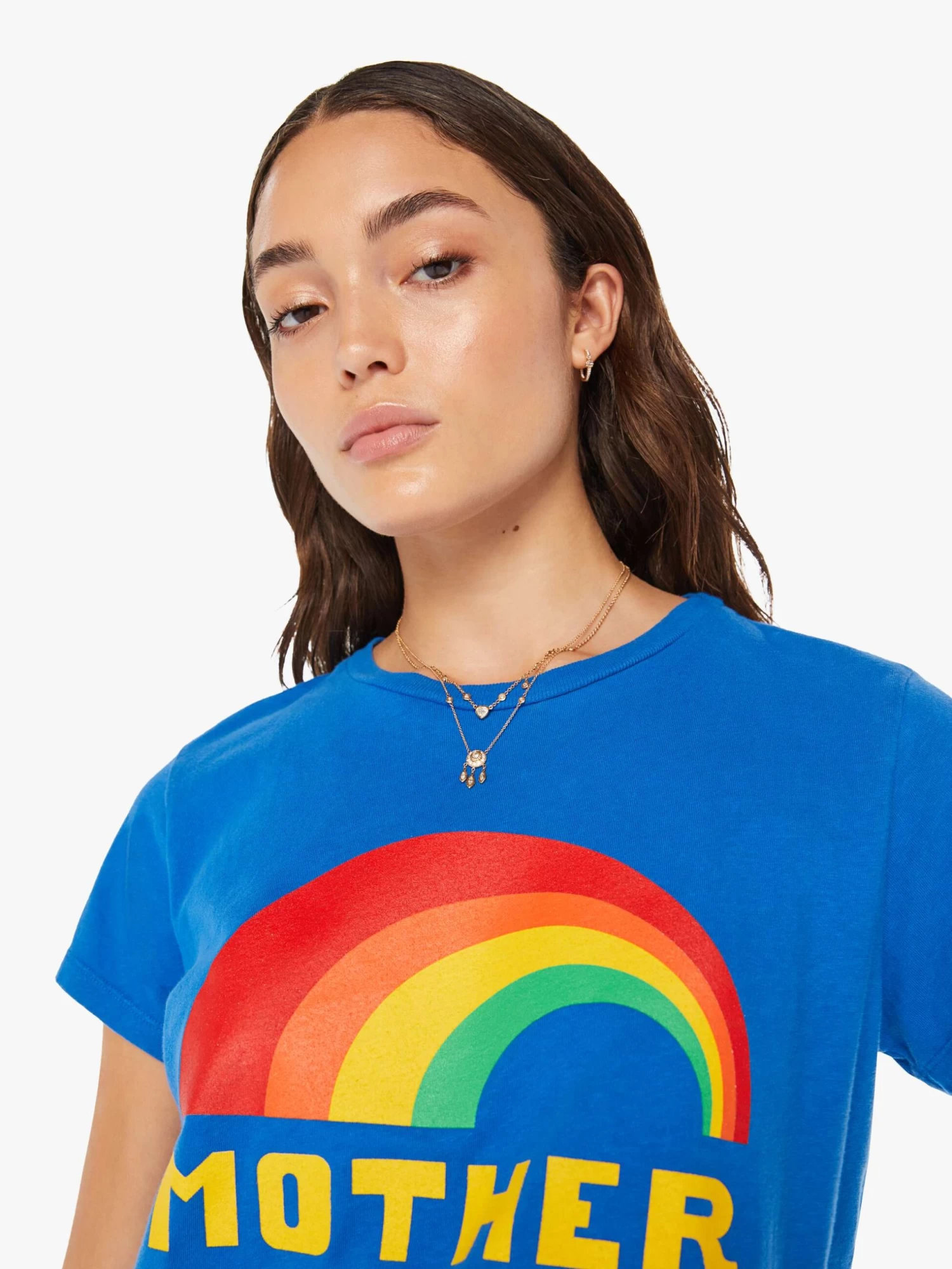 Follow the rainbow. A soft crewneck with a slim fit for a vintage look and feel. Made from a recycled-cotton blend in blue, the tee features a rainbow graphic and MOTHER’s name in yellow on the front.