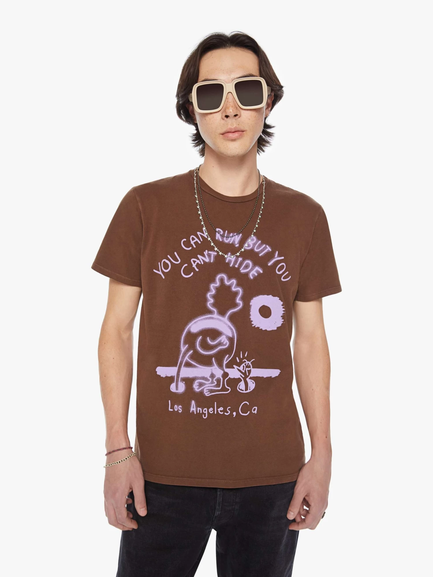 Face it. A classic crewneck tee with short sleeves and a boxy fit. Made from 100% cotton in brown, The Buster in You Can Run features a lavender roadrunner graphic with text on the front.