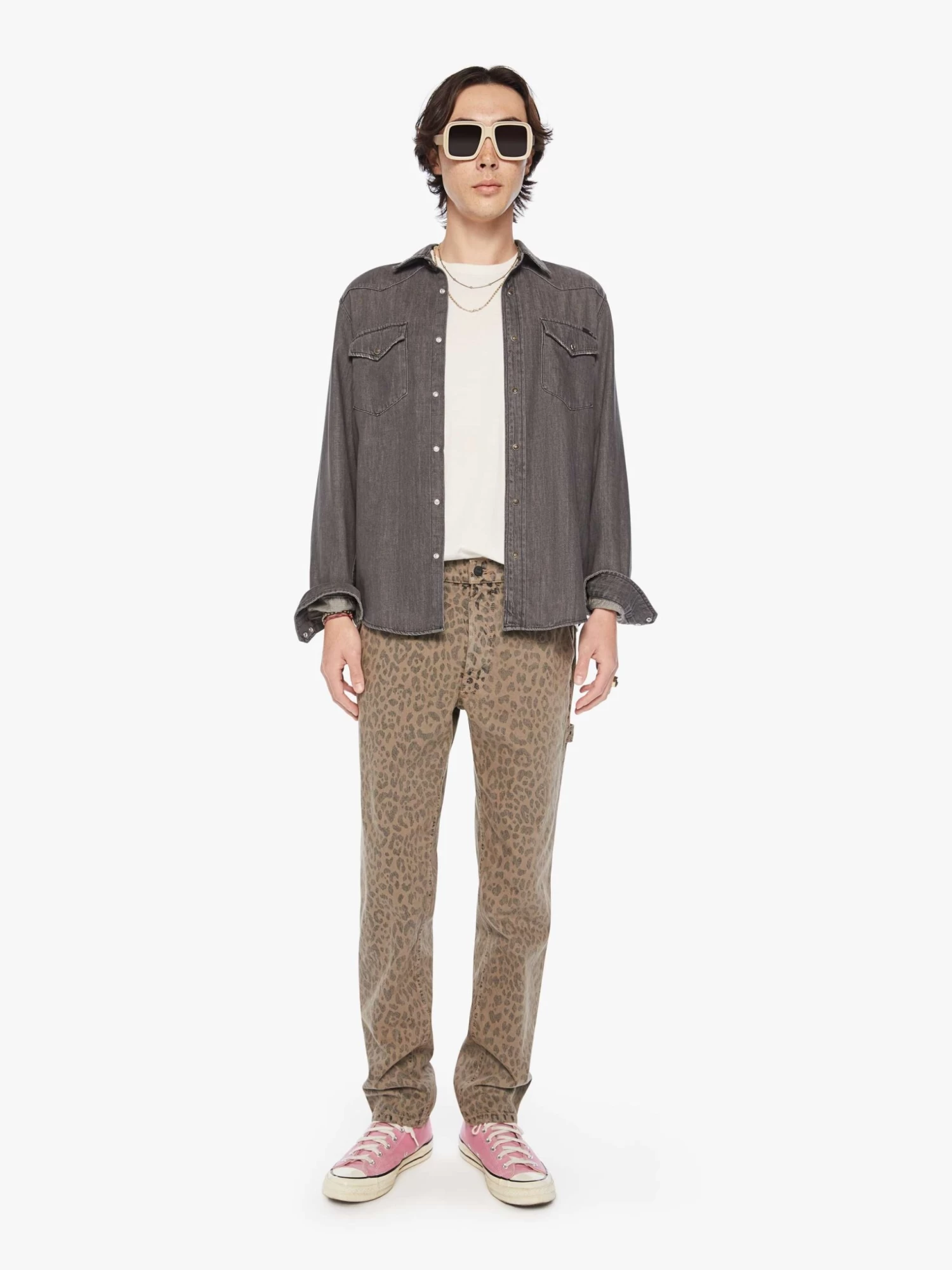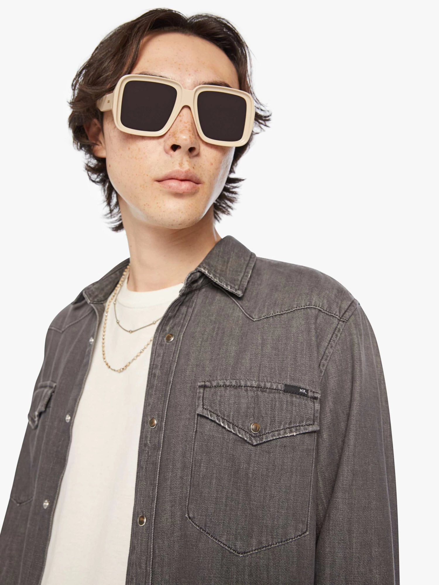 Anyone home? A classic Western-inspired shirt with buttons, flap patch pockets, long sleeves and a curved hem. Made from 100% cotton, Light’s Out is a dark black wash with subtle fading at the shoulders.