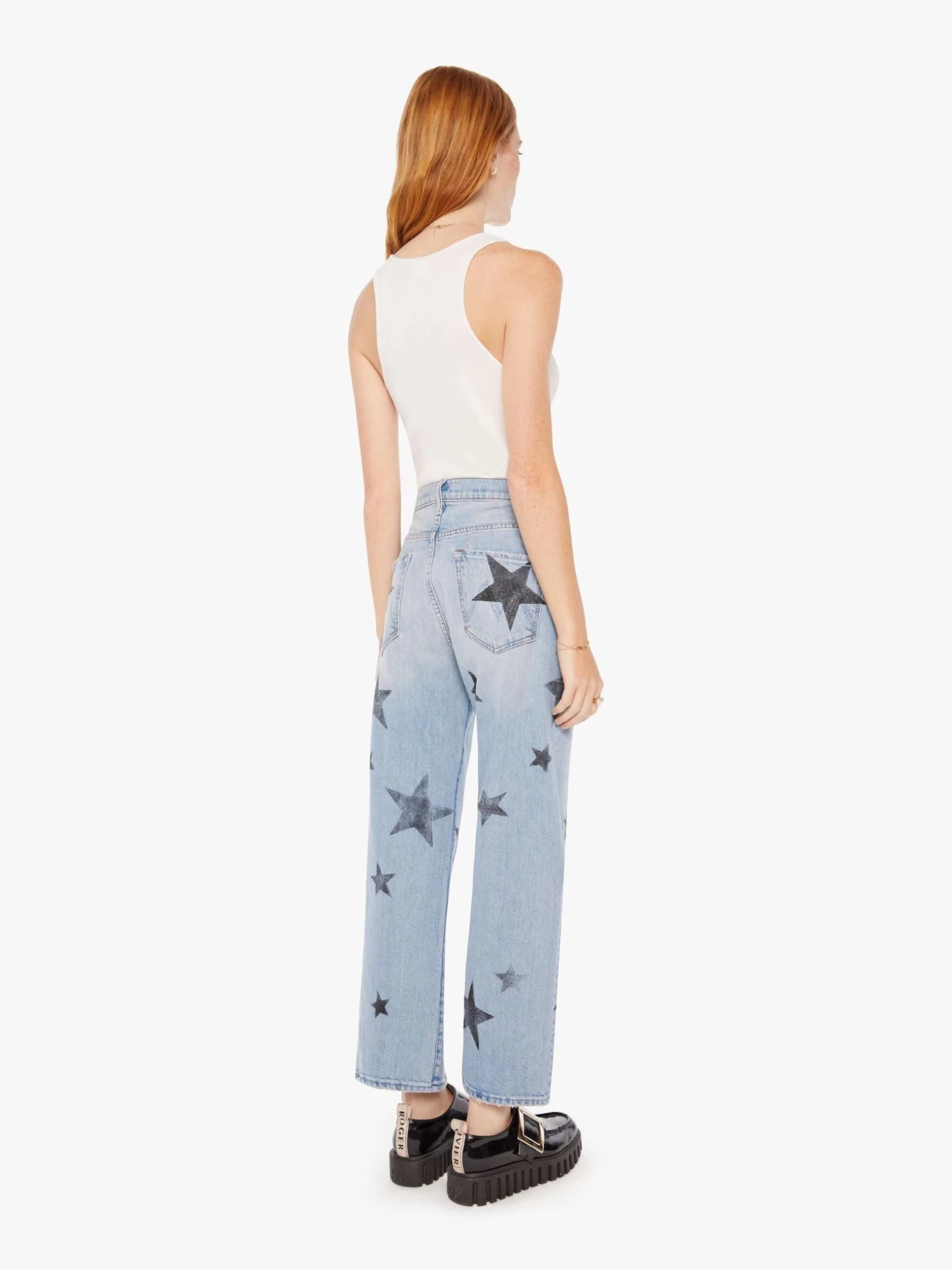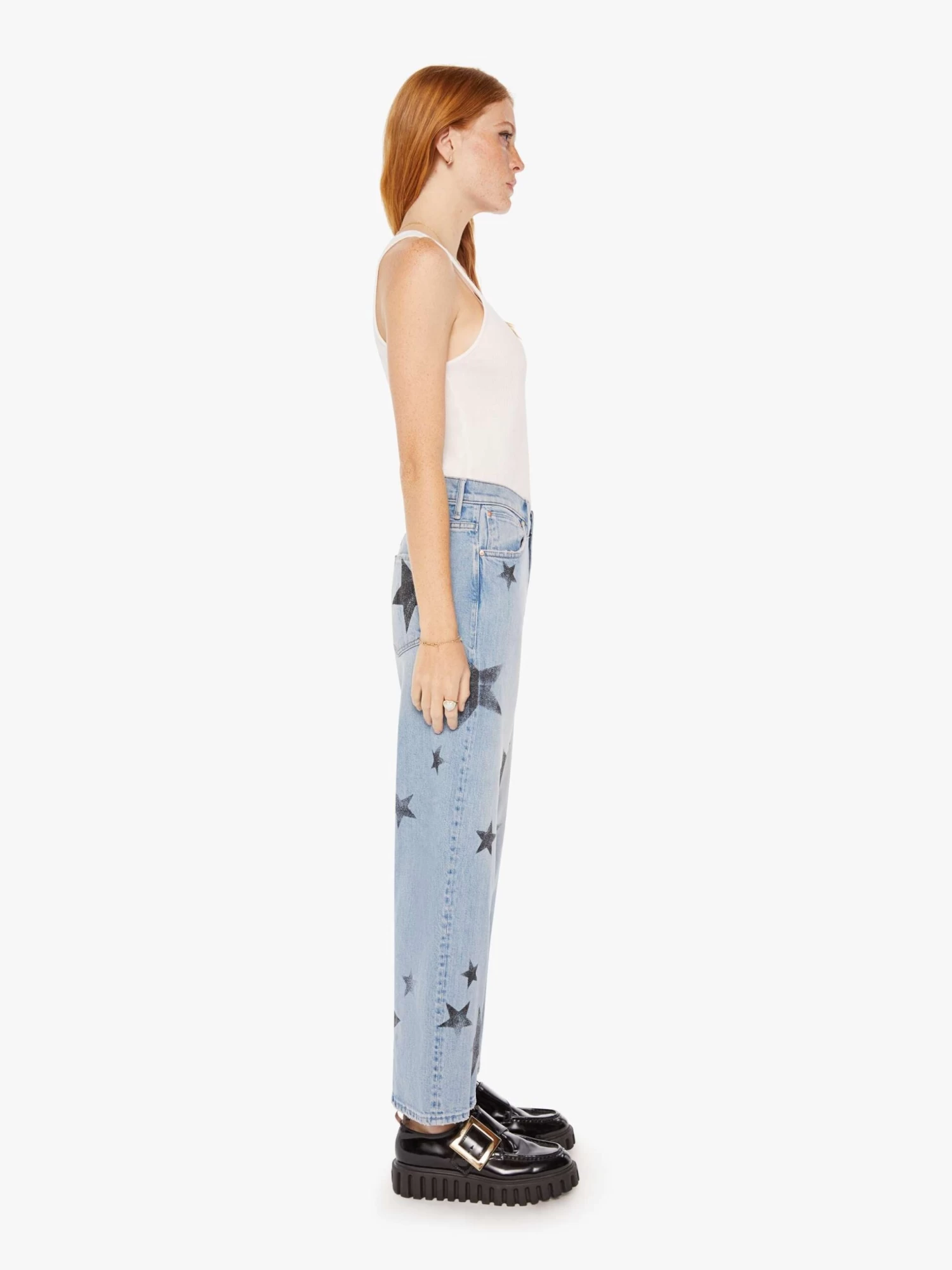 When stars align. Jeans designed to sit lower on the hips with a loose straight leg and an ankle-length inseam with a clean hem. Made from semi-rigid SUPERIOR denim, Star Crossed is a light blue wash with faded stars throughout.