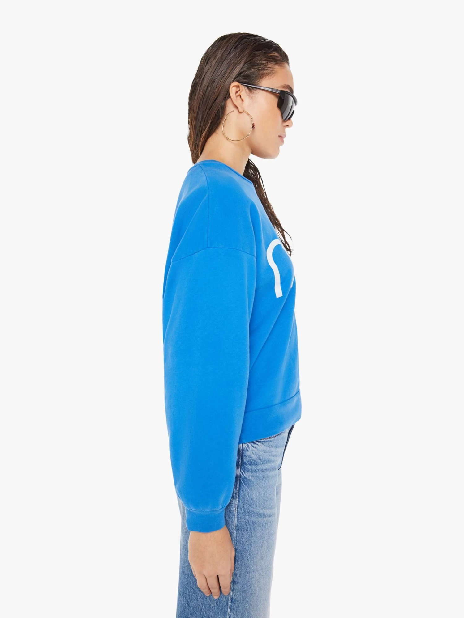 Totally tubular. A crewneck sweatshirt with dropped sleeves and a relaxed fit. Made of 100% cotton in blue, the sweatshirt features MOTHER’s name in an 80s-inspired text graphic on the front.