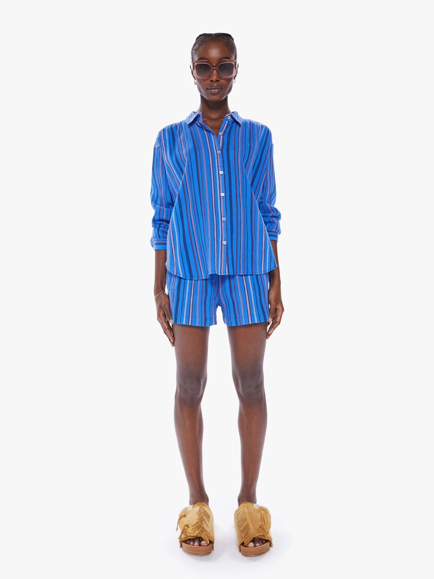 Nautical by nature. A classic button down top with drop shoulders, a curved hem and a slightly oversized fit. Made from 100% cotton, the top is designed in a vertical blue stripe pattern with shell buttons. Catch MOTHER’s drift?