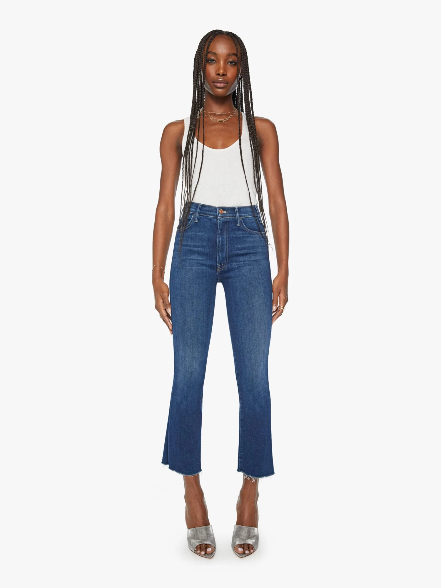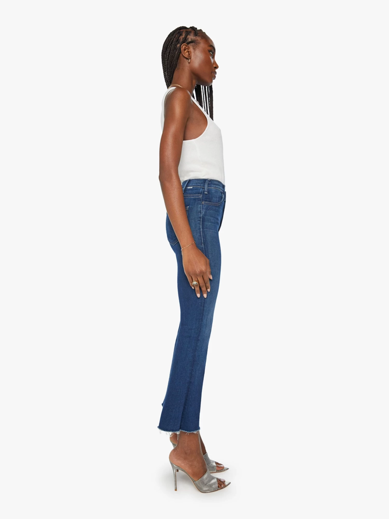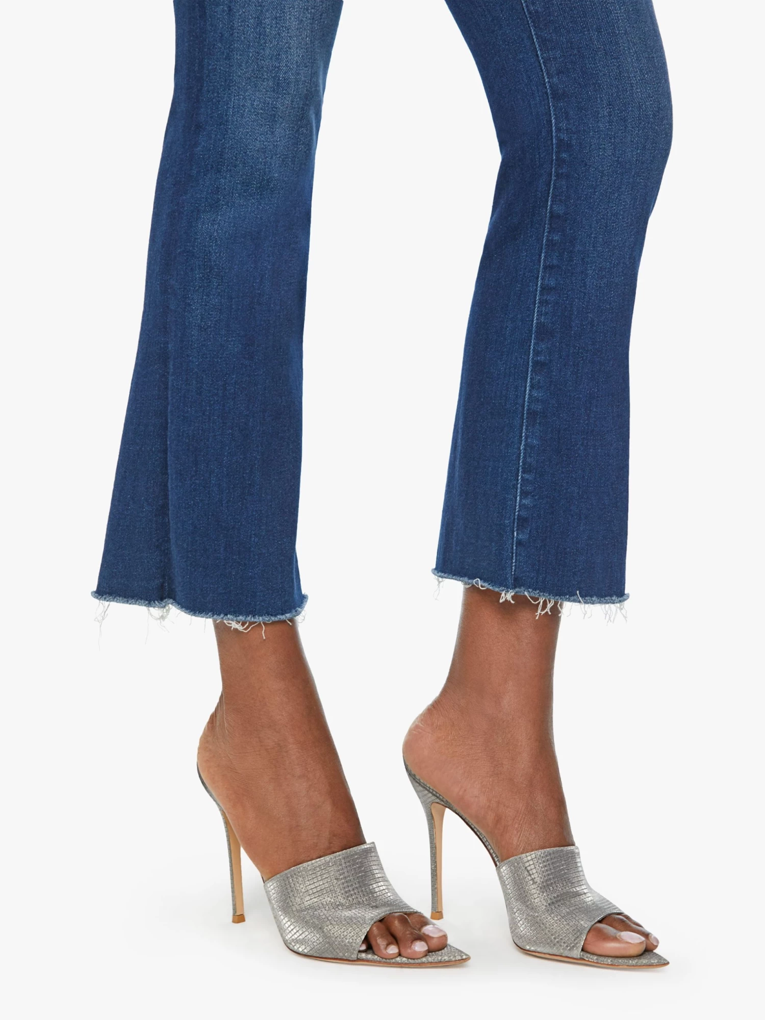 Get your popcorn. This bestselling high-rise flare has an ankle-length inseam and a raw hem. Cut from stretch denim, Home Movies is a medium blue wash with subtle fading and whiskering.