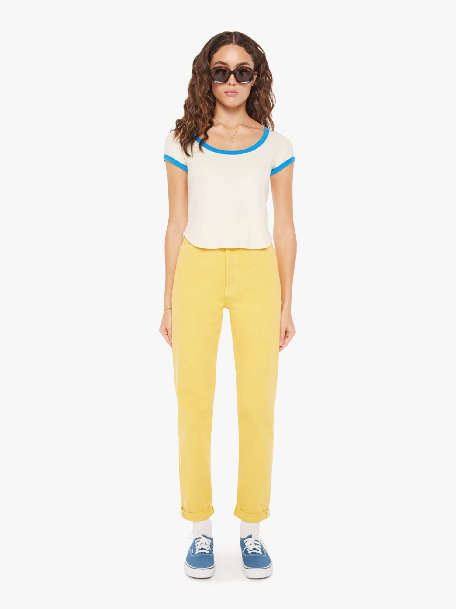 Finders keepers, losers weepers. A scoop neck tee from MOTHER’s Lost & Found capsule, a nostalgic collection that evokes the carefree spirit of a summer vacation in the 80s and feels just like a family road trip in that trusty old station wagon. The baby tee is designed with a deep scoop neck, short sleeves, a slim fit and a cropped, curved hem. It’s made from 100% cotton in cream with bright-blue trim.