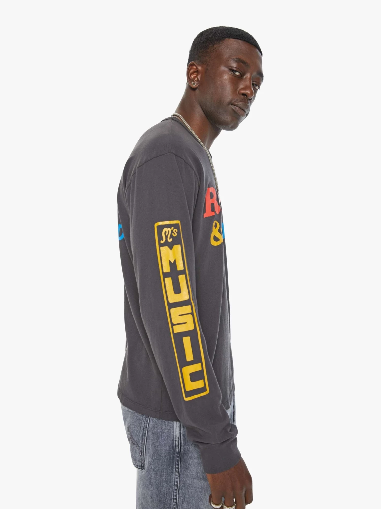 Analog isn’t dead. An oversized long sleeve tee with drop shoulders and a loose fit. Made from 100% cotton in faded black, the tee features a colorful text graphic on the front and down the arms.