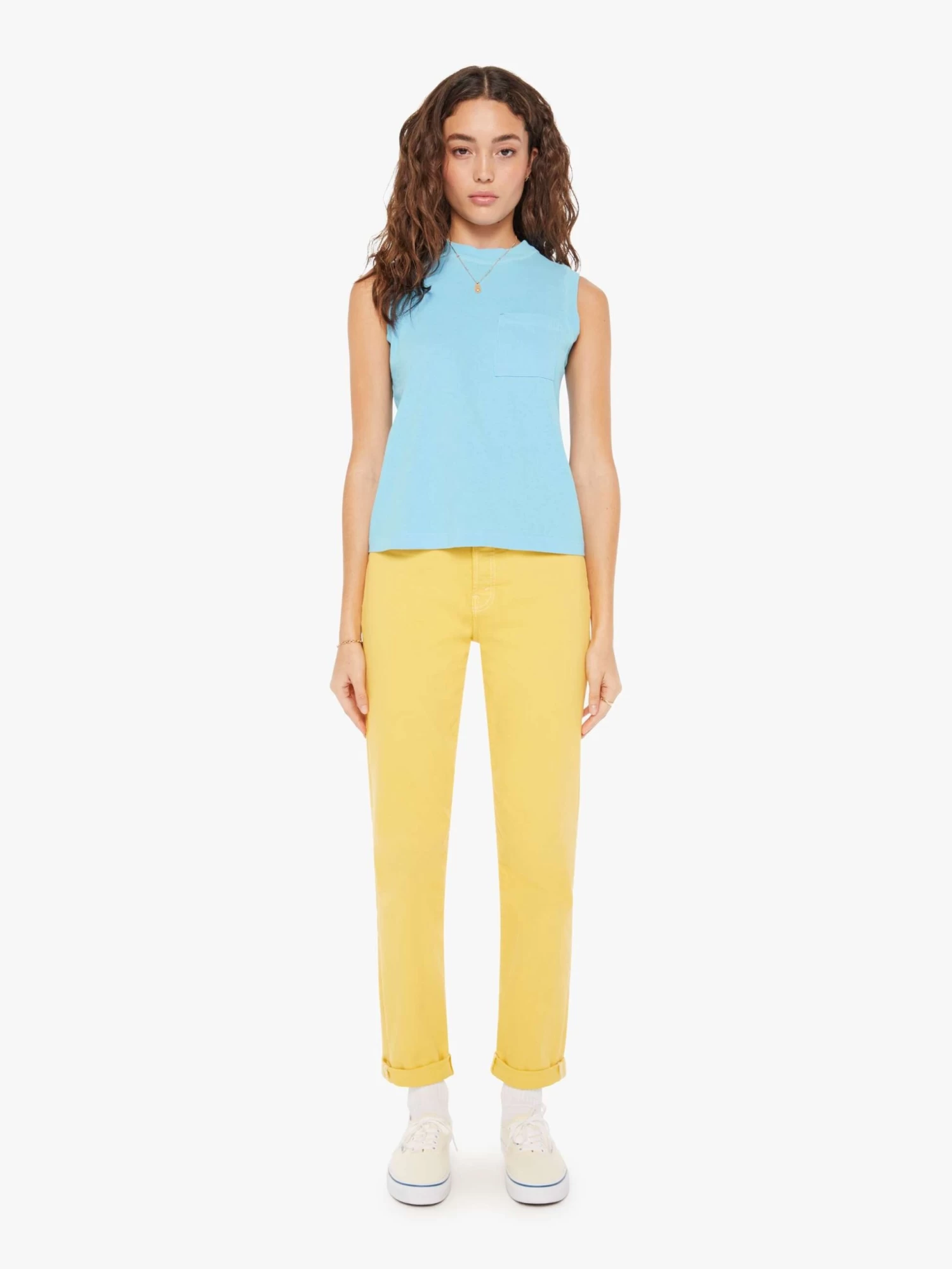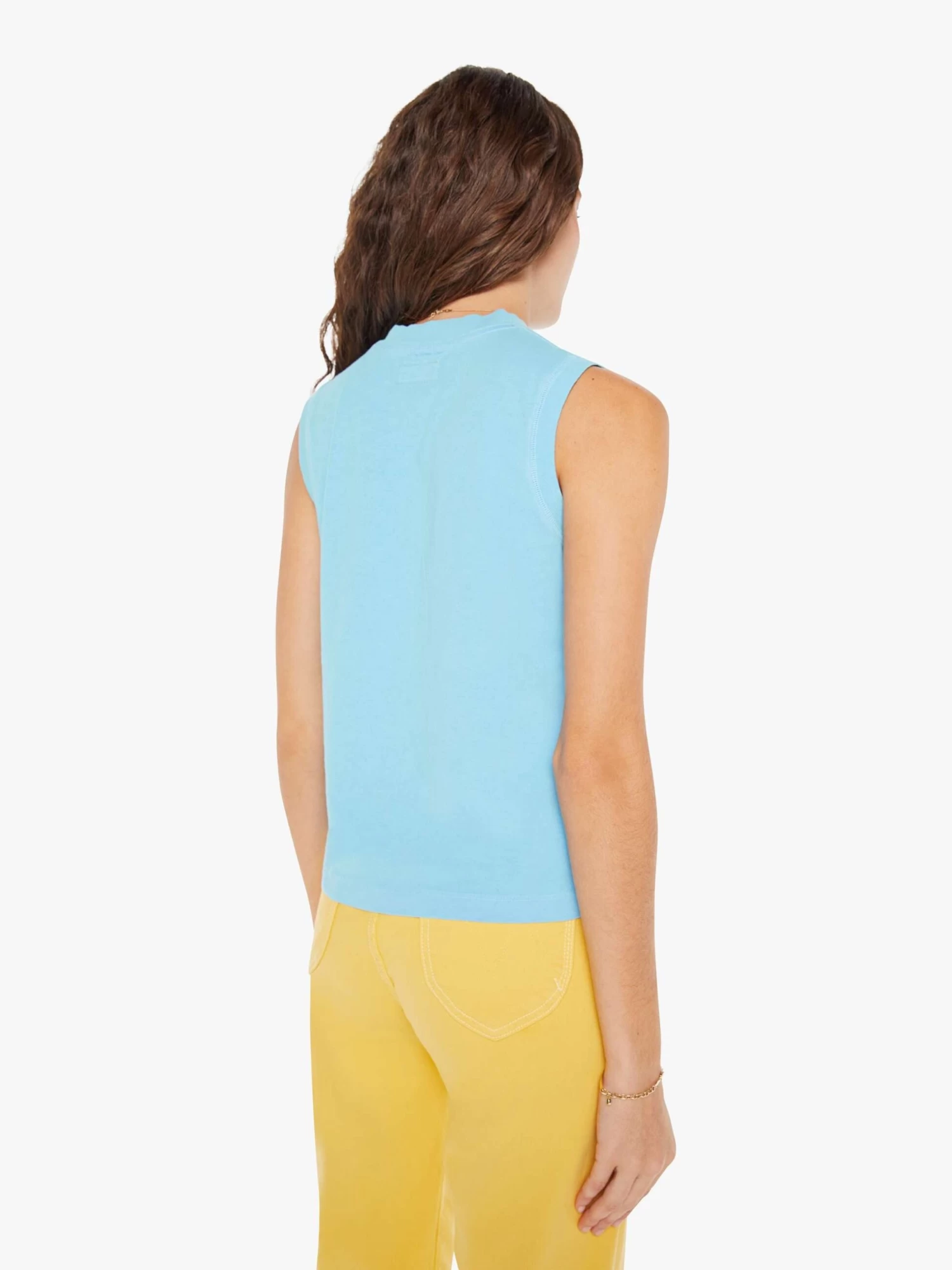 Finders keepers, losers weepers. A crewneck tank from MOTHER’s Lost & Found capsule, a nostalgic collection that evokes the carefree spirit of a summer vacation in the 80s and feels just like a family road trip in that trusty old station wagon. This vintage-inspired tank is designed with a crew neck, patch pocket and relaxed fit. It’s made from 100% cotton in sky blue with tonal contrast stitching.