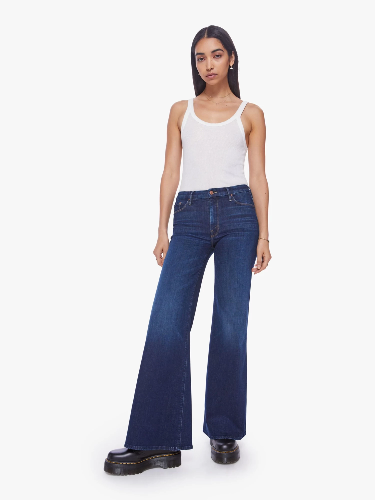 Out of bounds. 70s-inspired wide leg jeans with a high rise, 32-inch inseam and a clean hem. Made from stretch denim, Off Limits is a dark-blue wash with subtle fading and whiskering.