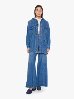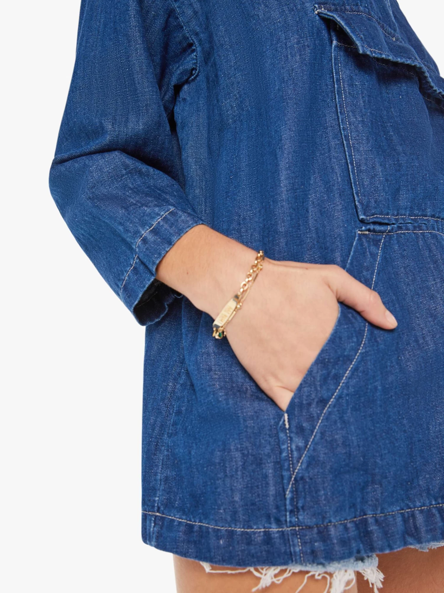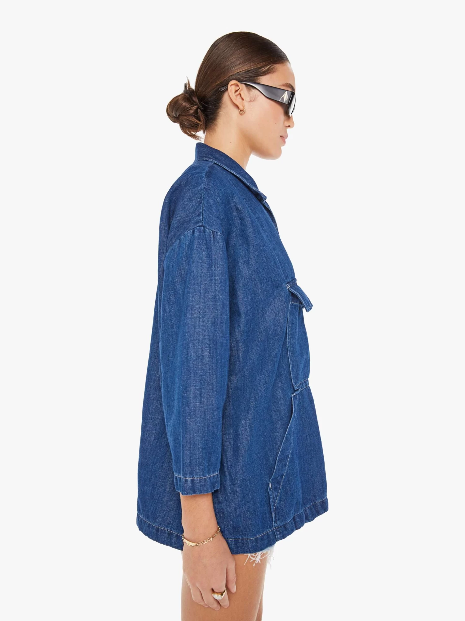 Marseille it ain’t so. A collared denim top with a V-neck, 3/4-length sleeves, extra-large patch pockets and a boxy, oversized fit. Made from a blend of cotton and linen, Moving To Marseille is a dark blue wash. Au revoir.