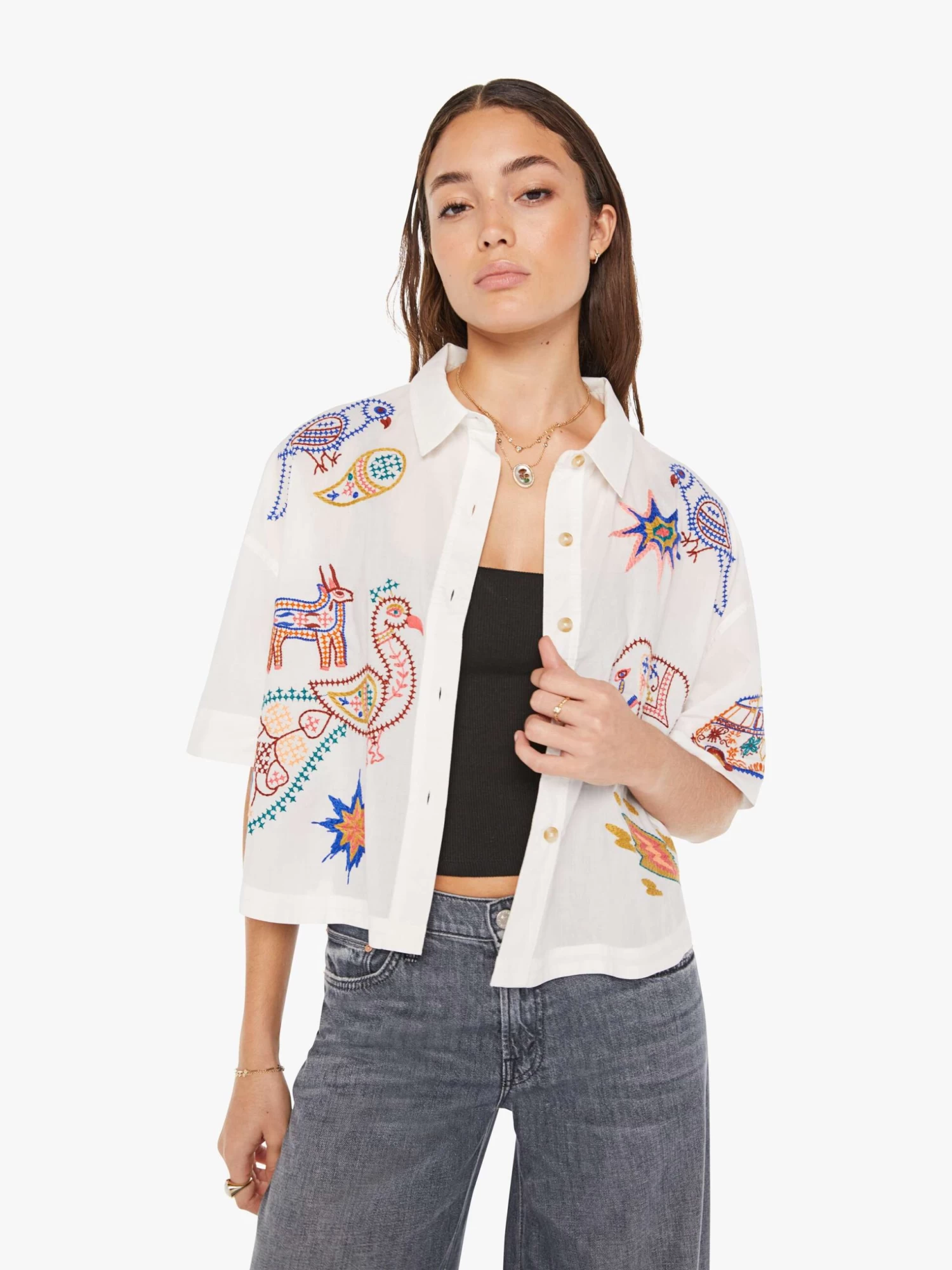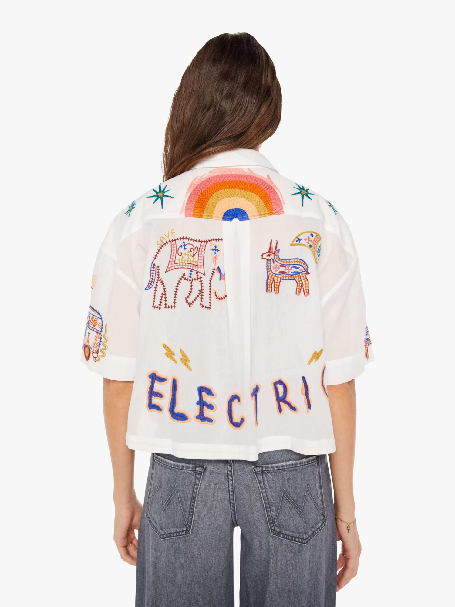 High frequency. A collared short-sleeve button-up with drop shoulders and a cropped, boxy fit. Cut from 100% cotton in white, the top is designed with embroidered animals, stars, rainbows and text throughout. It’s electric.