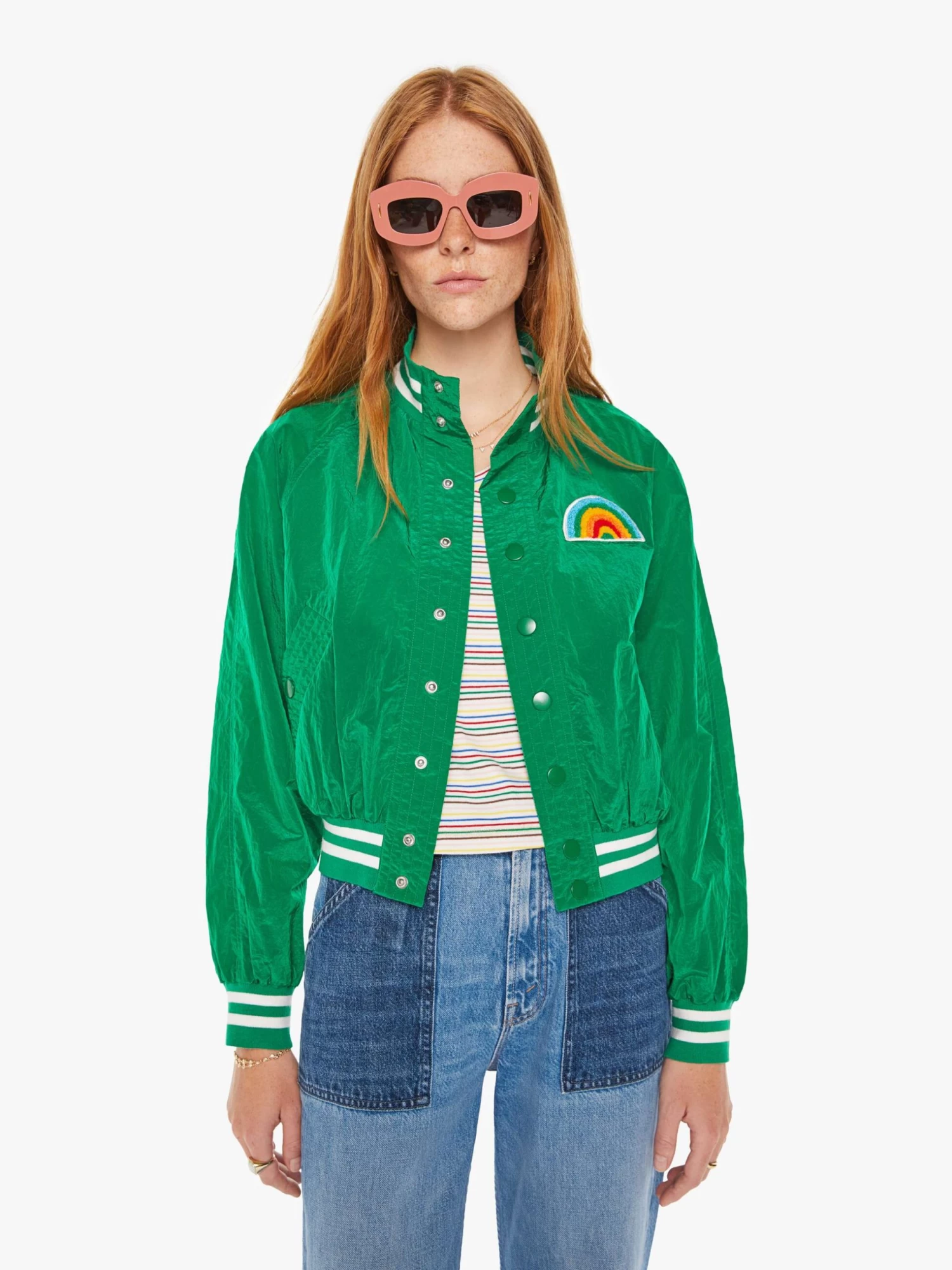 Green machine. A lightweight windbreaker with a high neck, bat-wing sleeves, slit pockets, ribbed hems and a cropped fit. Designed in green, the jacket features white stripes at the hems, a rainbow patch at the chest and monochrome snaps down the front.