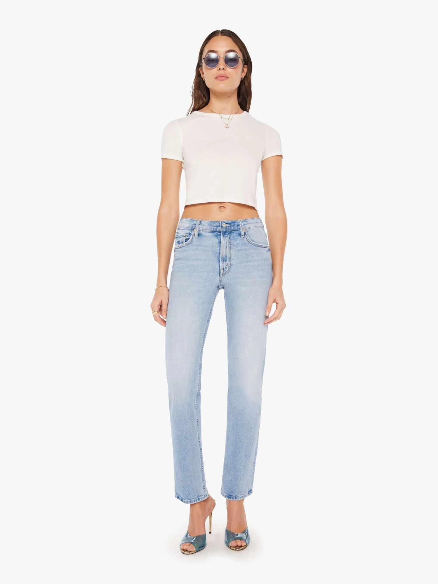 Shape up. High-rise jeans with a narrow straight leg and a 31-inch inseam with a clean hem. Cut from semi-rigid SUPERIOR denim, Don’t Be A Square is a light-blue wash with subtle fading, whiskering and distressed details throughout.