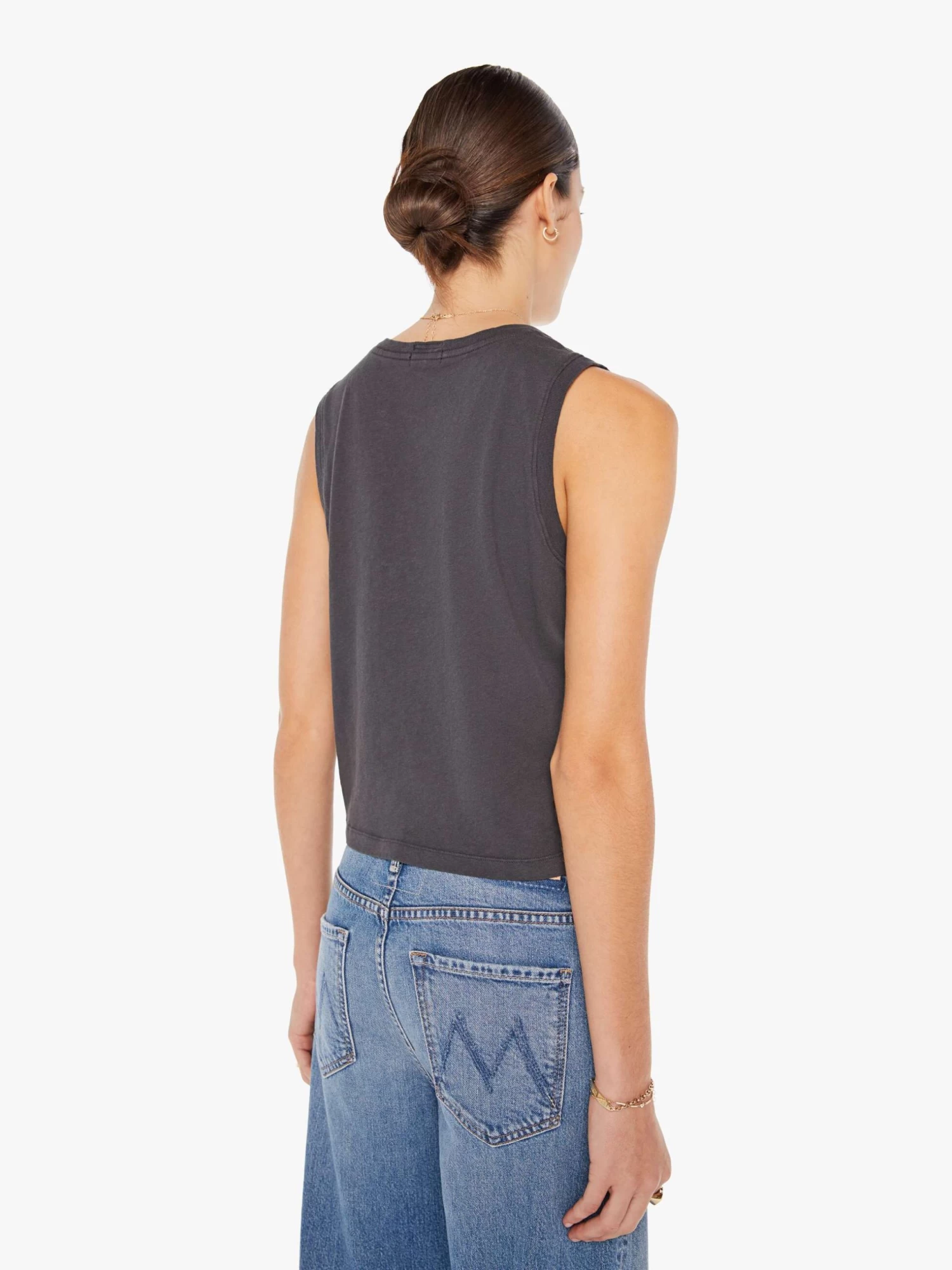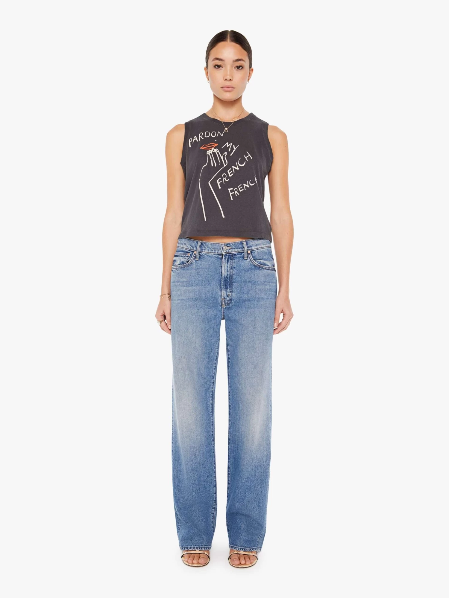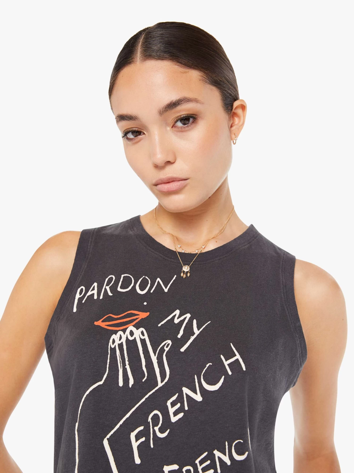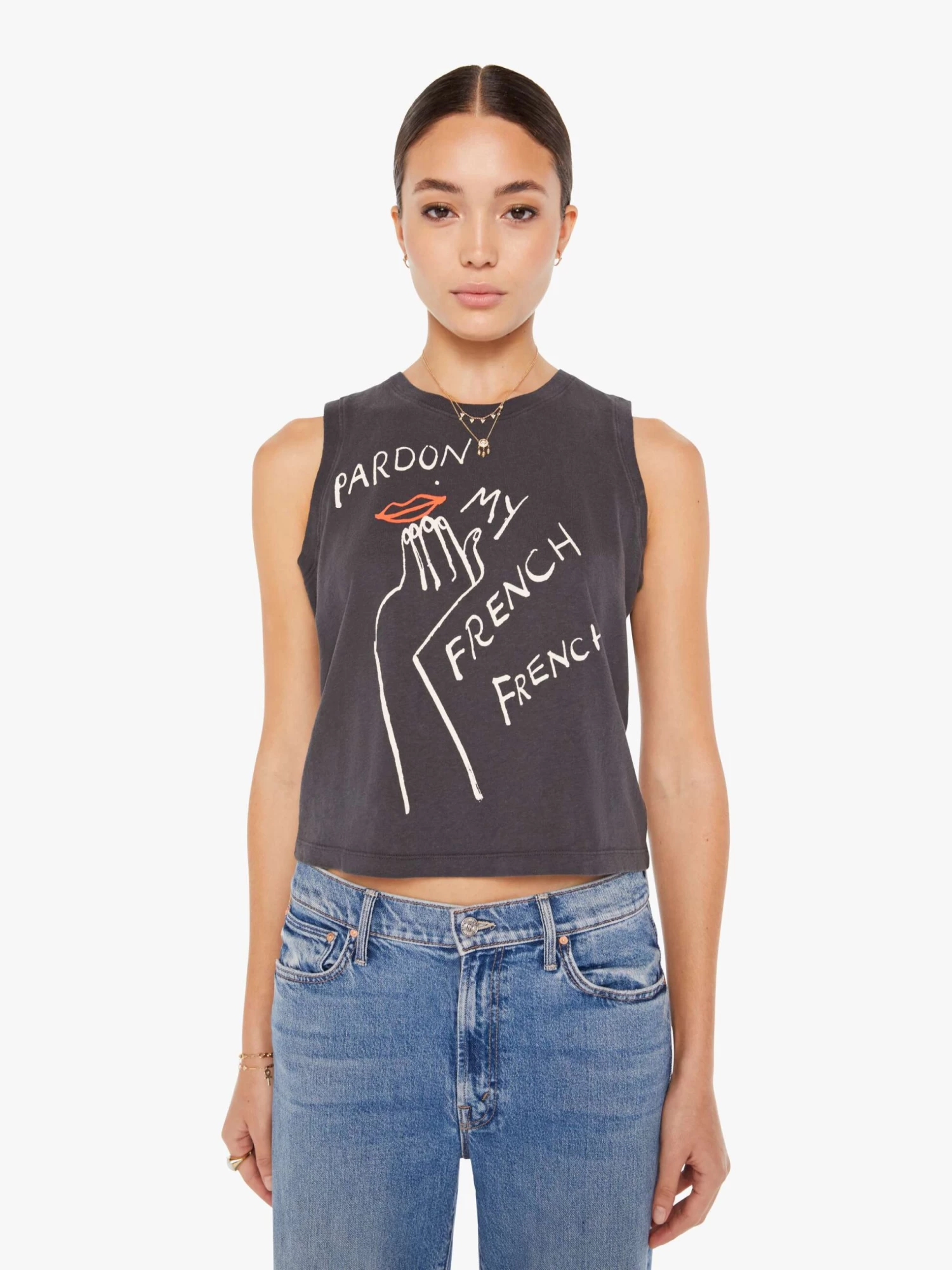 Excusez-moi. A cropped muscle tee with a crewneck and boxy fit. Cut from a recycled cotton blend, the faded black tank features a hand-drawn graphic with text on the front.