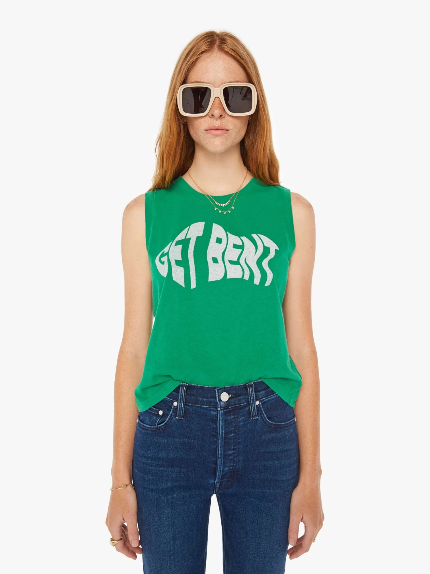 Shape shifter. A cropped muscle tee with a crewneck and boxy fit. Cut from 100% cotton, the green tank features a faded text graphic in white on the front.