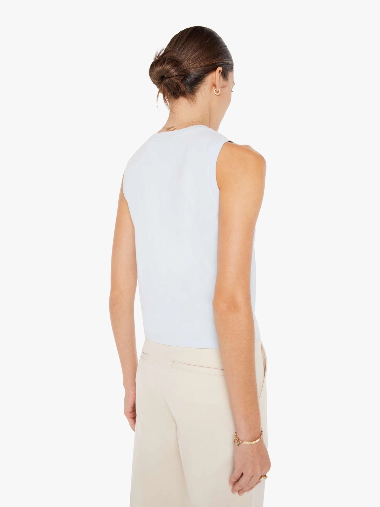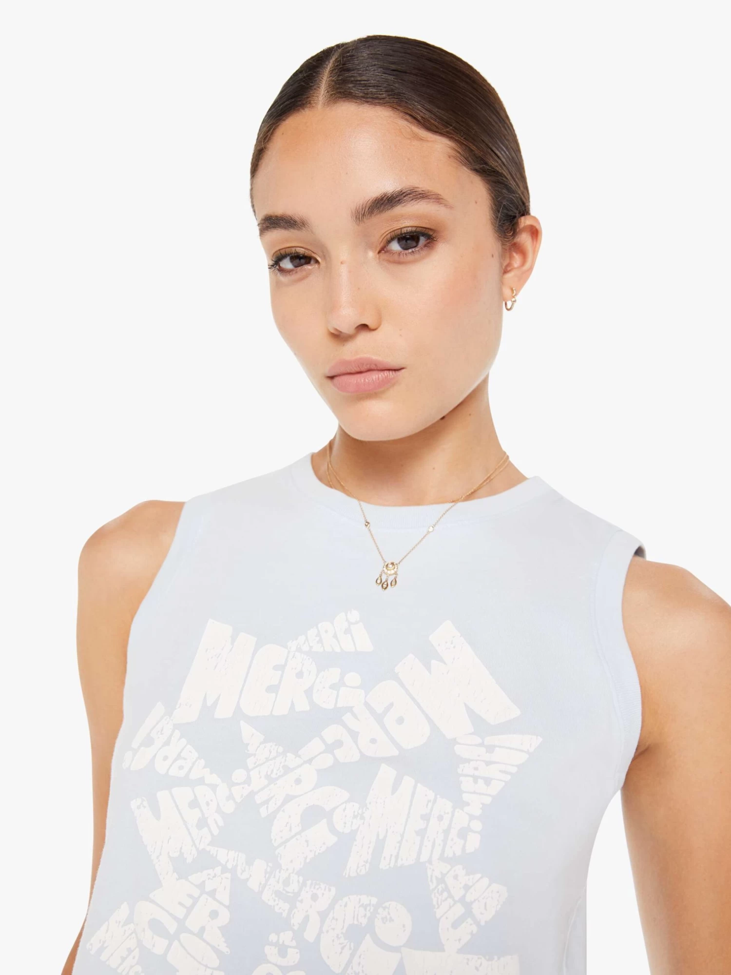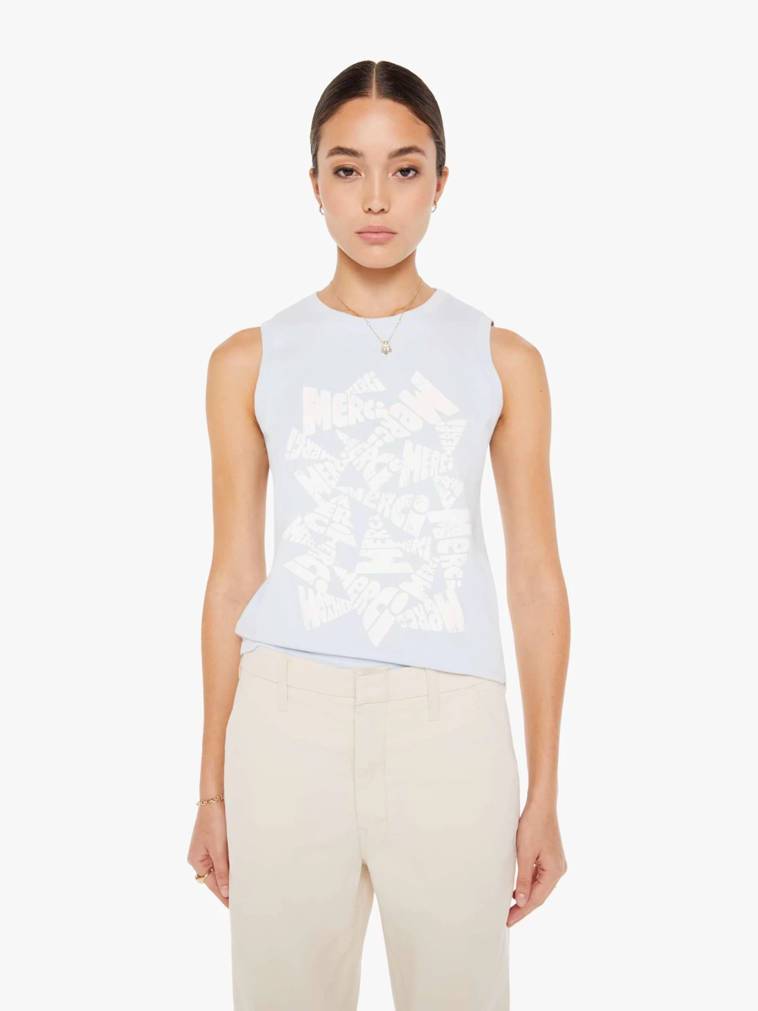 Many thanks. A cropped muscle tee with a crewneck and boxy fit. Cut from 100% cotton, the ice-blue tank features a white text graphic in French on the front.