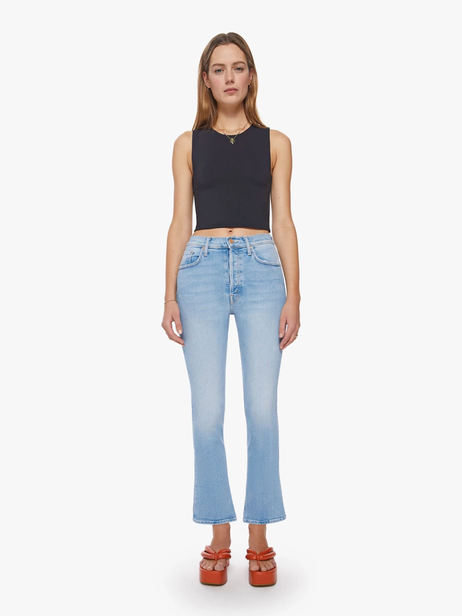 Don’t worry, be a hippie. A high-rise flare with a button fly and a clean ankle-length hem. Cut from stretch denim, Cat Daddy is a light blue wash with subtle fading, whiskering and distressed details.