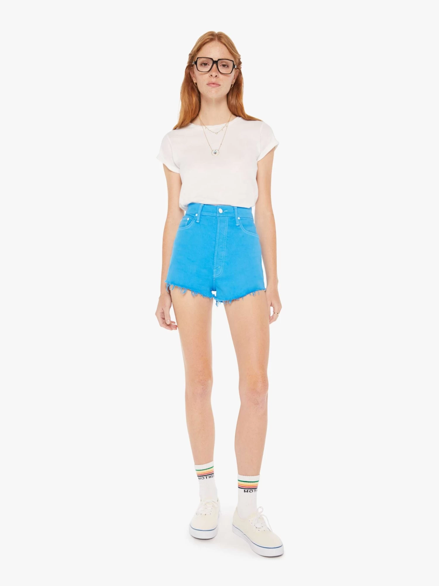Finders keepers, losers weepers. Shorts from MOTHER’s Lost & Found capsule, a nostalgic collection that evokes the carefree spirit of a summer vacation in the 80s and feels just like a family road trip in that trusty old station wagon. These vintage-inspired shorts are designed with a super-high rise, narrow fit and a short frayed hem. They’re made from a cotton blend with a touch of stretch in bright blue with white contrast stitching.